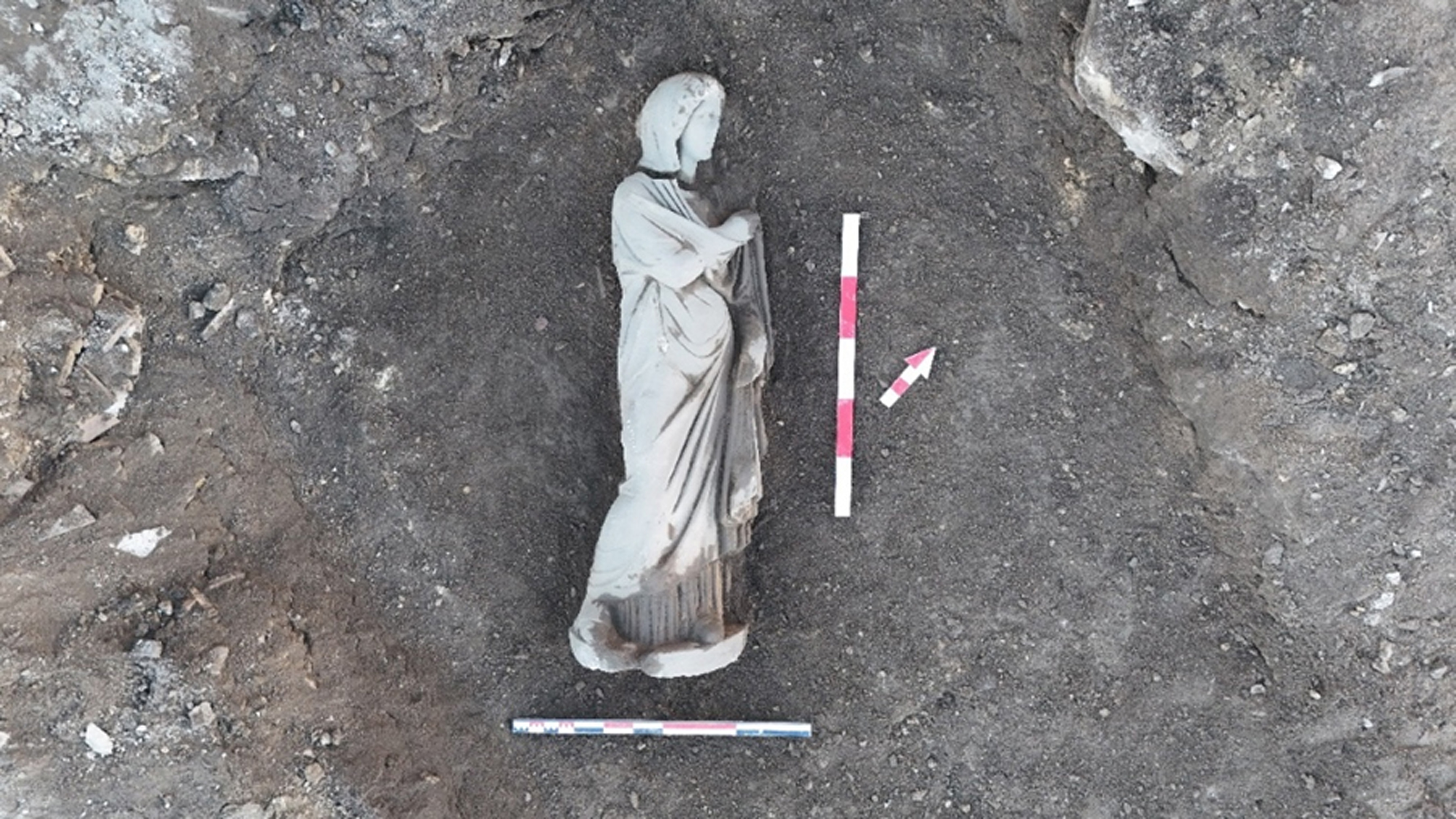 Antalya'nın doğusundaki Perge Antik Kenti'nde 2025 yılı kazı çalışmalarında öne çıkan buluntular, mermerden iki heykel ile bir altın sikke etrafında yoğunlaşıyor. MS 2-3'üncü yüzyıla tarihlenen Aphrodite-Eros kompozisyonunda, kaide üzerinde zarif bir duruşla betimlenen Aphrodite'in yanında, yunus üzerinde yan oturmuş Eros figürü yer alıyor.