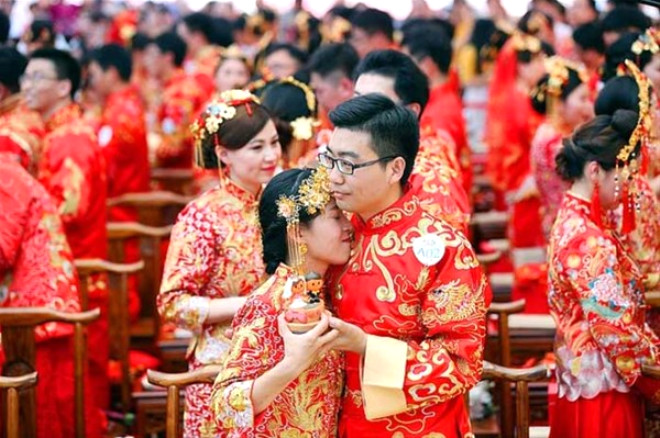 Alibaba çalışanları şirketin merkezinde 10 Mayıs günü toplu bir düğün törenini kutluyor.