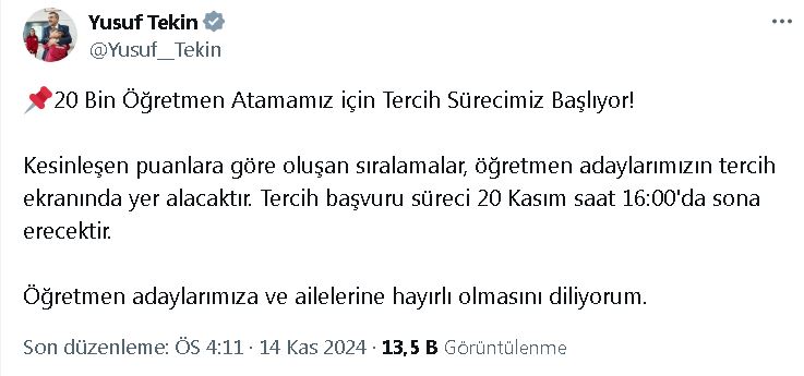 Bakan Tekin, sosyal medya hesabından yaptığı açıklamada, "20 bin öğretmen atamamız için tercih sürecimiz başlıyor. Kesinleşen puanlara göre oluşan sıralamalar, öğretmen adaylarımızın tercih ekranında yer alacaktır. Tercih başvuru süreci 20 Kasım saat 16.00'da sona erecektir. Öğretmen adaylarımıza ve ailelerine hayırlı olmasını diliyorum" dedi.