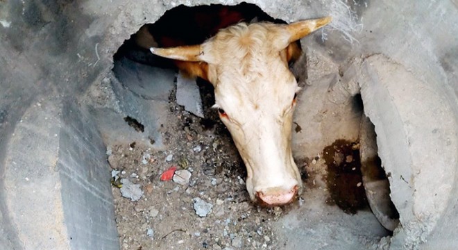 Yağmur suyu hattına düşen inek, kepçeyle kurtarıldı