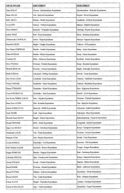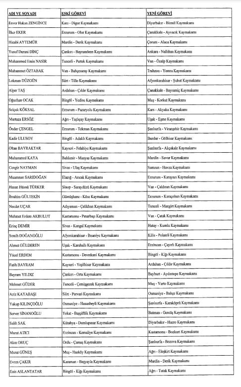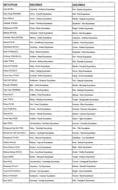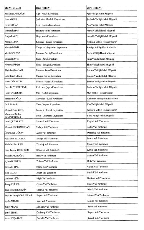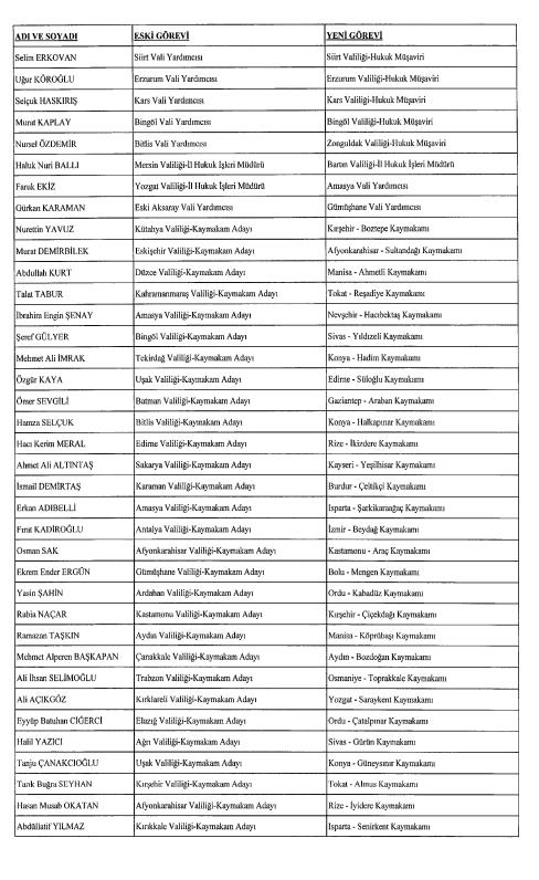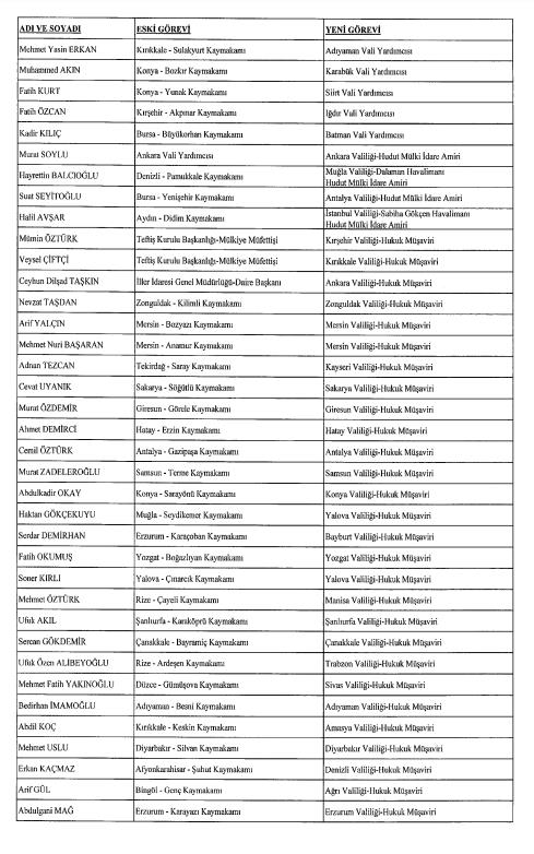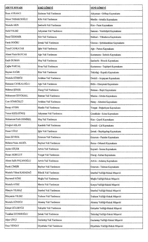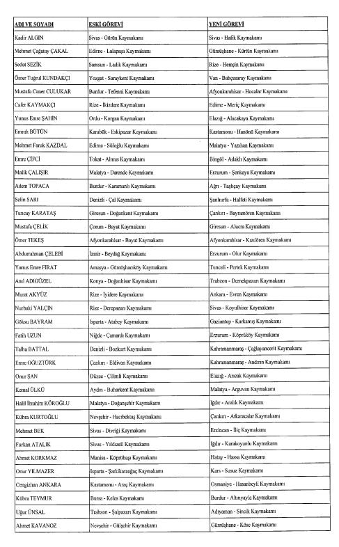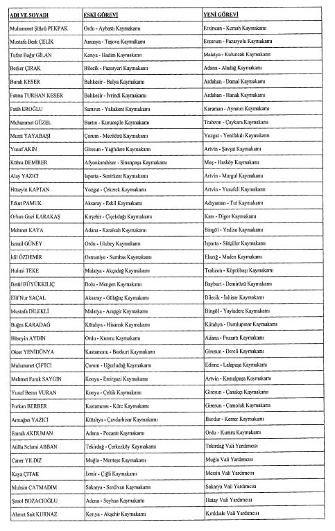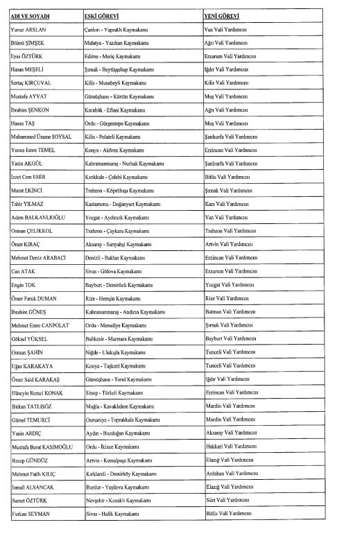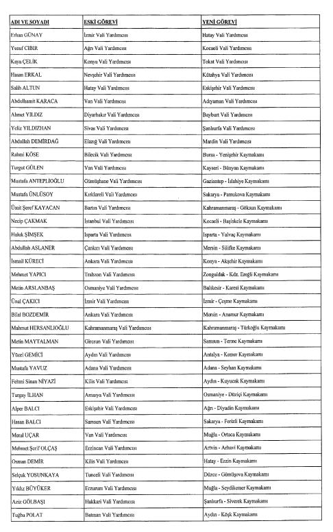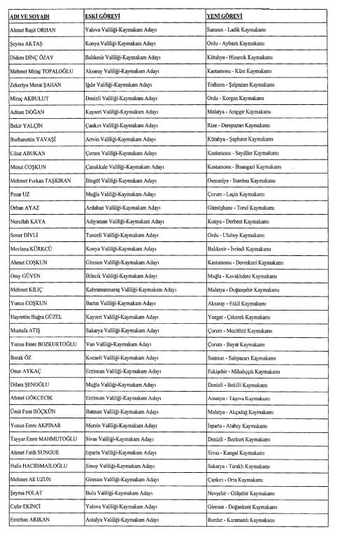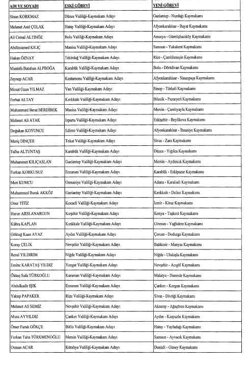 İzmir'de ise, Naci Aktaş, Seferihisar Kaymakamı; Adnan Çakıroğlu, Çiğli Kaymakamı; Gökhan Görgülüaslan, Konak Kaymakamı; Musa Sarı, Kemalpaşa Kaymakamı; Cevat Çelik, Menderes Kaymakamı; Fırat Kadiroğlu, Beydağ Kaymakamı; Onur Titiz, Kiraz Kaymakamı olarak görev aldı.