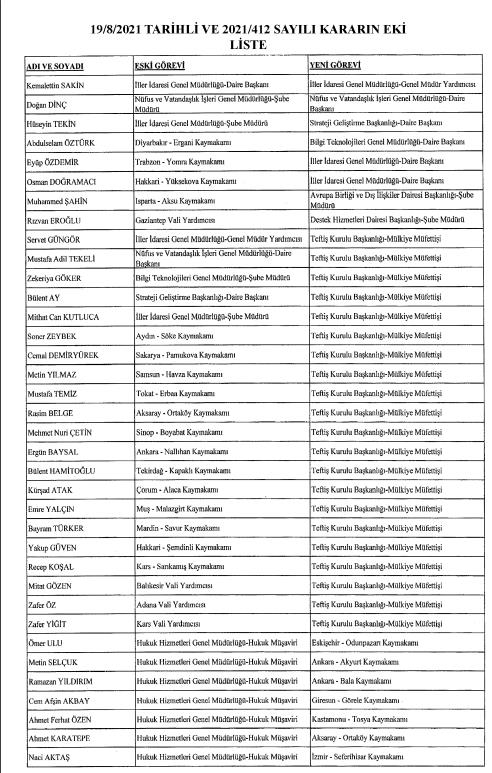 Cumhurbaşkanı Recep Tayyip Erdoğan'ın imzasıyla Resmi Gazete'nin bugünkü sayısında yayımlanan Mülki İdare Amirleri Atama Kararnamesi ile bulundukları yerlerde görev sürelerini tamamlayan veya hizmet ve mazeretleri gereğince kararname kapsamına alınan 624 mülki idare amirinin görev yerleri değiştirildi.