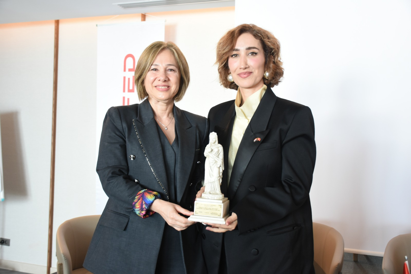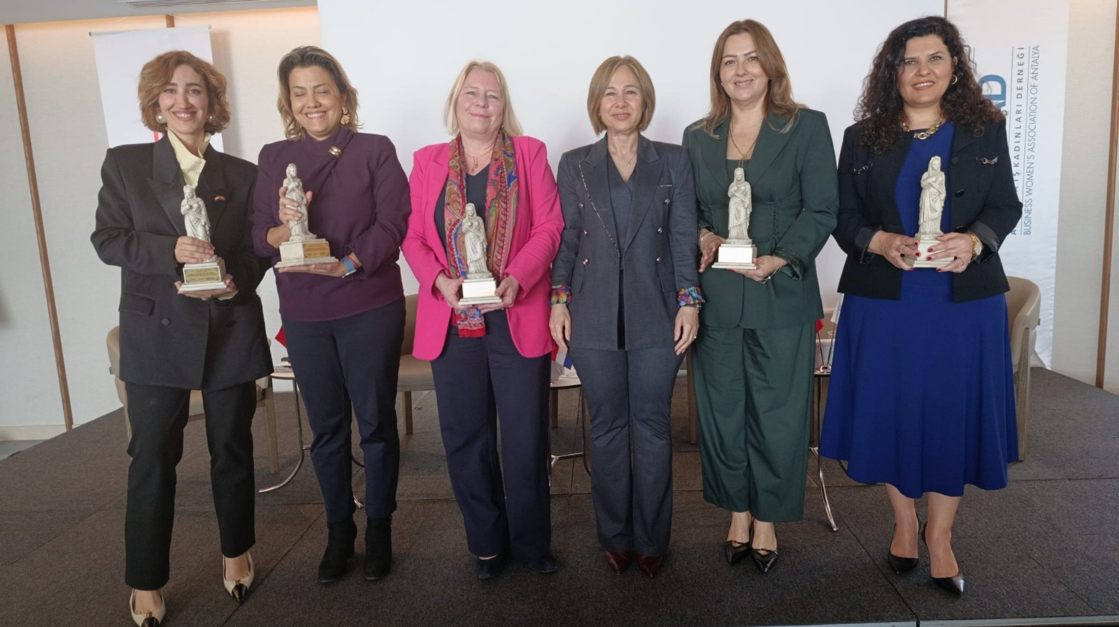 Plancia Magna’nın Mirası Yaşatılıyor Etkinlik sonunda konuşmacılara, Antalya tarihinin en önemli figürlerinden biri olan kentin ilk kadın belediye başkanı Plancia Magna'nın heykelciği takdim edildi. Kadınların tarihten bugüne süregelen liderlik gücünü simgeleyen bu anlamlı hediye sonrası, katılımcıların bir araya geldiği toplu fotoğraf çekimi ile program sona erdi.