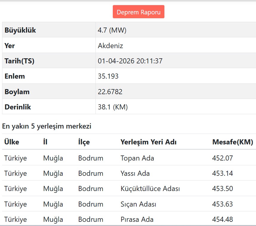 Depremin 38.01 kilometre derinlikte meydana geldiğini kaydeden AFAD'ın deprem raporu şöyle: