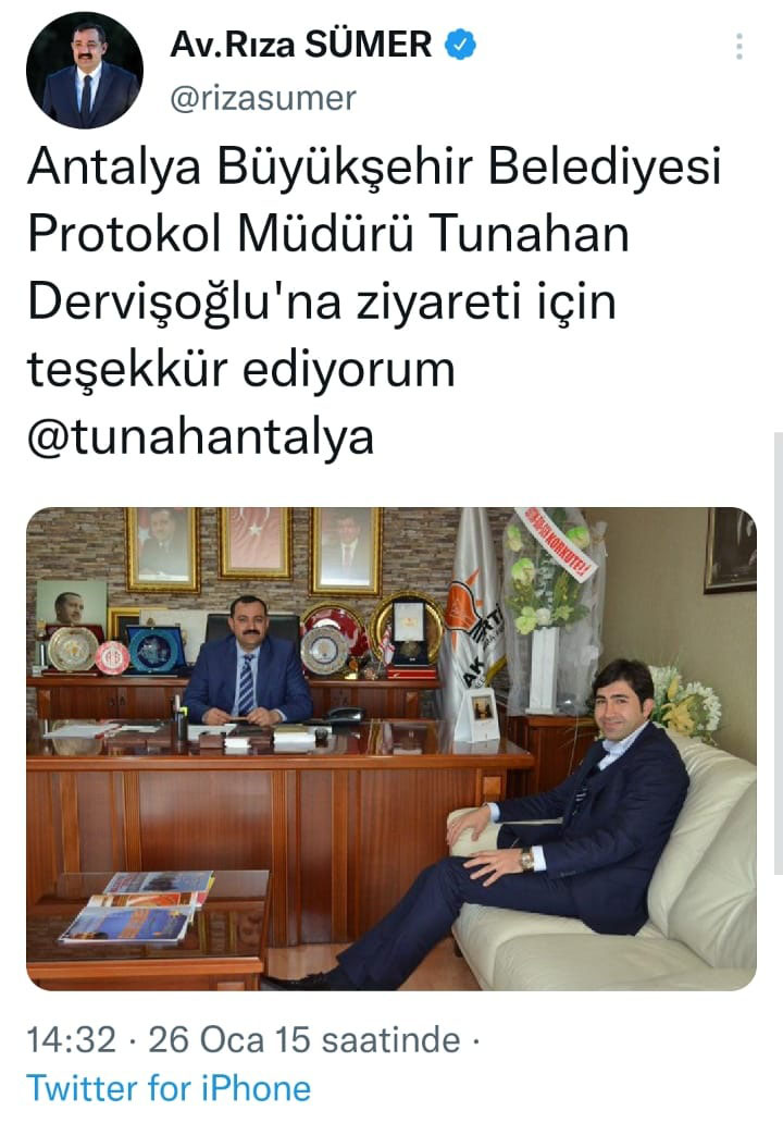 Dervişoğlu, Türel'in protokol müdürü iken dönemin AKP İl Başkanı Rıza Sümer'i ziyaret etmiş