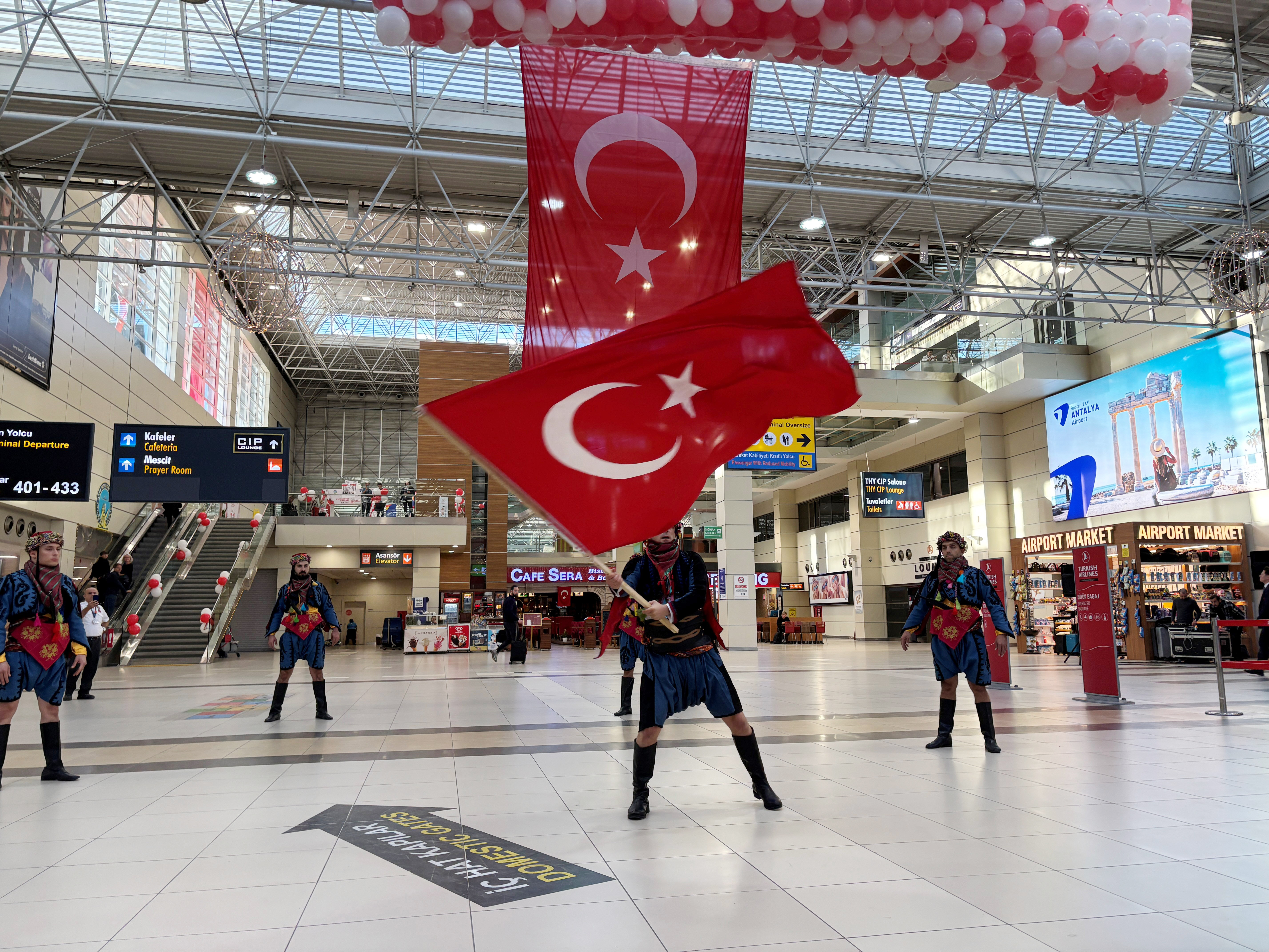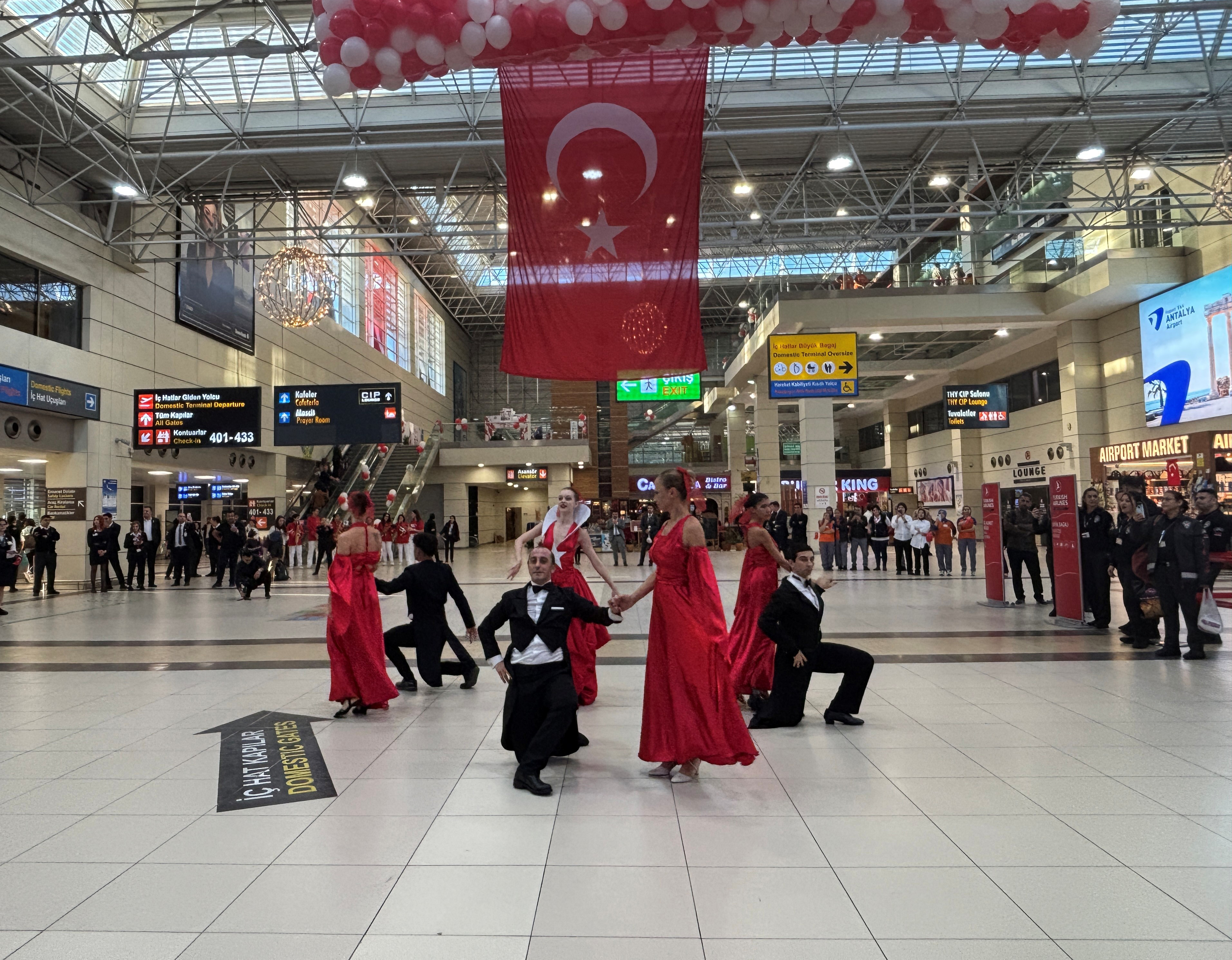 Fraport TAV Antalya Havalimanı, Cumhuriyetin 102. yıl dönümünü büyük bir gurur ve heyecanla kutladı. Birlik ve beraberlik duygularının pekiştiği kutlamalar, yolcular ve çalışanlar tarafından büyük ilgiyle karşılandı. Terminal, kırmızı beyaz balonlar, Atatürk posterleri ve Türk bayraklarıyla süslendi. Kutlamalar kapsamında geleneksel Zeybek gösterisi izleyicilerden yoğun alkış alırken, Vals performansı Cumhuriyetin modern ve zarif ruhunu yansıttı. Bando ekibinin çaldığı marşlar ve coşkulu ezgilerle terminalde büyük bayram havası yaşandı. Ayrıca etkinlikler kapsamında BFA yolculara özel ikramlarda bulundu.