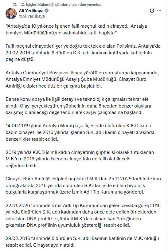 İçişleri Bakanı Ali Yerlikaya, Antalya Emniyet Müdürlüğü’nce yürütülen çalışmayı sanal medya hesabından duyurdu. Antalya'da 29 Şubat 2016’da öldürülen S.K. adlı kadının faillerinin yakalanmasına yönelik Antalya Cumhuriyet Başsavcılığı’nca yürütülen soruşturma kapsamında, dosya ile ilgili detaylı ve teknolojik çalışmalar tekrar ele alındı. Olayı gerçekleştiren şüphelinin daha önceden benzer olaylara karışmış olabileceği değerlendirilerek arşiv çalışmasına başlandı. 14 Haziran 2019'da Antalya'nın Muratpaşa ilçesinde öldürülen K.K.D. isimli kadın ile 2016 yılında öldürülen S.K.’nin cinayeti arasında benzerlikler tespit edildi. K.K.D. cinayetinin şüphelisi olarak tutuklanan M.K.'nin 2016 yılında işlenen cinayetin de faili olabileceği değerlendirildi. Cinayet Büro Amirliği ekipleri, cezaevindeki M.K.'den 25 Kasım 2025’te kan örneği alarak, 2016 yılında öldürülen S.K.'den elde edilen biyolojik bulgularla karşılaştırmak üzere İzmir Adli Tıp Kurumu’na gönderdi. 22 Ocak 2026’da İzmir Adli Tıp Kurumu’ndan gelen cevaba göre, 2016 yılında öldürülen S.K.’den daha önce elde edilen örneklerden çıkartılan DNA profili ile şüpheli M.K.'den alınan kan örneğinden çıkartılan DNA profilinin uyumluluk gösterdiği tespit edildi. S.K.’nin katilinin de M.K. olduğu tespit edildi. Cinayet aydınlatıldı.