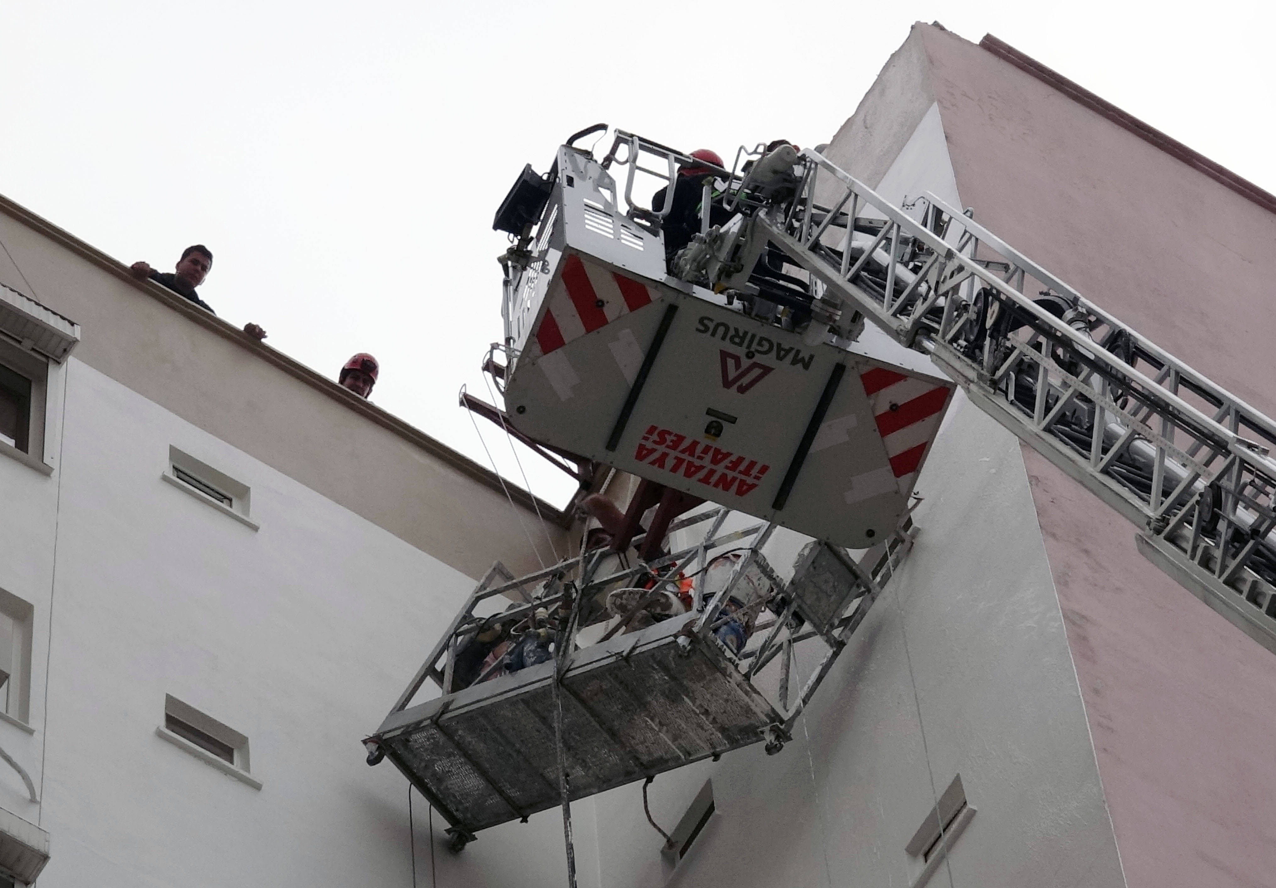 Olay, saat 14.00 sıralarında Muratpaşa ilçesi Yeşilbahçe Mahallesi 1447 Sokak’ta meydana geldi. Apartmanın dış cephe boyamasını yapan işçiler Sedat Karaçay ve Ömer Karayaluk’un içinde bulunduğu iskele, duvarın bir kısmının yıkılması sonucu 12'nci katta asılı kaldı. Durumu gören diğer işçilerin ihbarıyla adrese ekipler sevk edildi. Kısa sürede adrese ulayan ulaşan itfaiye ekibi, merdivenli kurtarma aracıyla iskeleye ulaştı. Yaklaşık yarım saatlik çalışmayla mahsur kalan Karaçay ile Karayaluk, merdivene alınarak, indirildi.