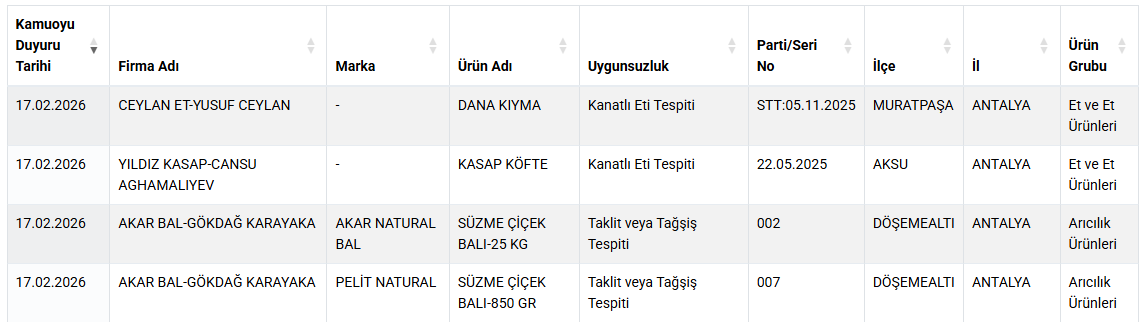 Tarım ve Orman Bakanlığı'nın güncellediği 17 Şubat 2026 tarihli taklit ve tağşiş gıdalar listesinde Antalya’dan da firmalar yer aldı. Antalya'nın Muratpaşa ilçesinde faaliyet gösteren Ceylan Et'e ait dana kıyma ürünlerinde kanatlı eti tespit edildi. Aksu ilçesinde faaliyet gösteren Yıldız Kasap'a ait kasap köftede kanatlı eti tespiti yapıldı. Döşemealtı'nda faaliyet gösteren Akar Bal'ın süzme çiçek balında taklit veya tağşiş tespit edildi. Listede, firmaya ait iki ayrı “süzme çiçek balı” ürününün yer aldığı görüldü.