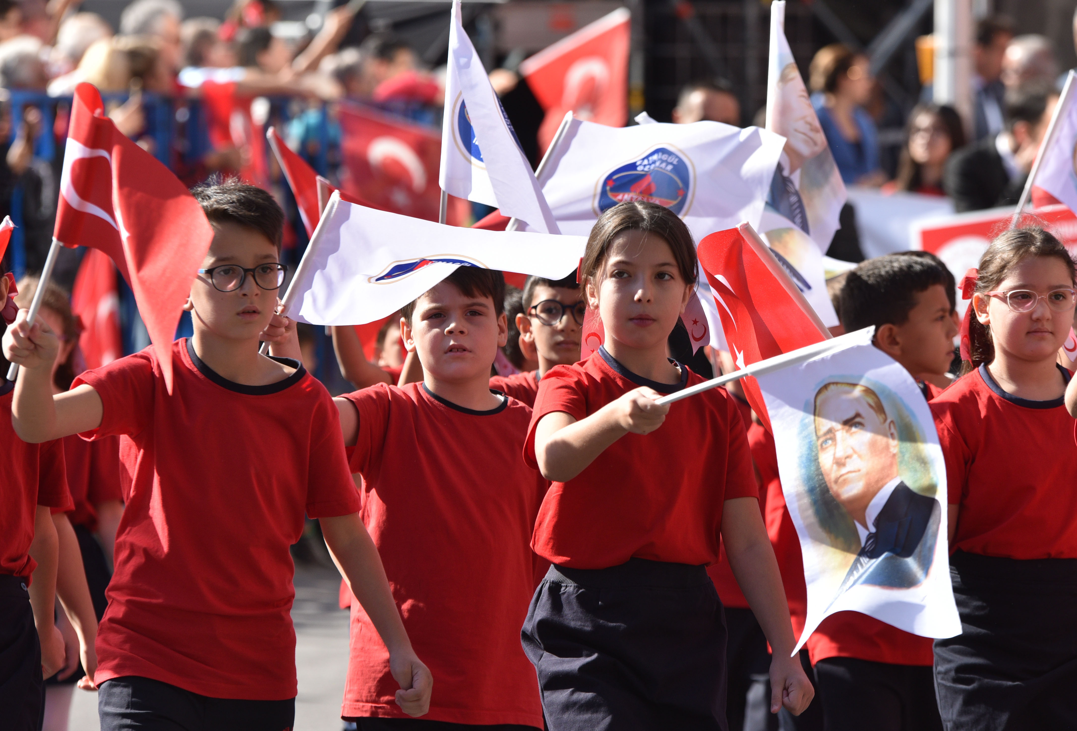 Konuşmaların ardından törene katılan öğrencilerin, askeri birliklerin, polis ve atlı polis birliklerinin, Sahil Güvenlik ekiplerinin, gazilerin geçiş töreni düzenlendi. Tören geçişine katılan komandoların geçişi sırasında vatandaşlar alkışlarla karşılık verdi. Öğrenciler ise Mustafa Kemal Atatürk'ün sözleri yazılı pankartlarla yürüyüşe katılırken, çocuklar ise aileleriyle birlikte alanda coşkulu töreni izledi. Tören geçişi sırasında polis ve Sahil Güvenlik helikopterleri ise alçak uçuş yaparak korteje havadan katıldı.
