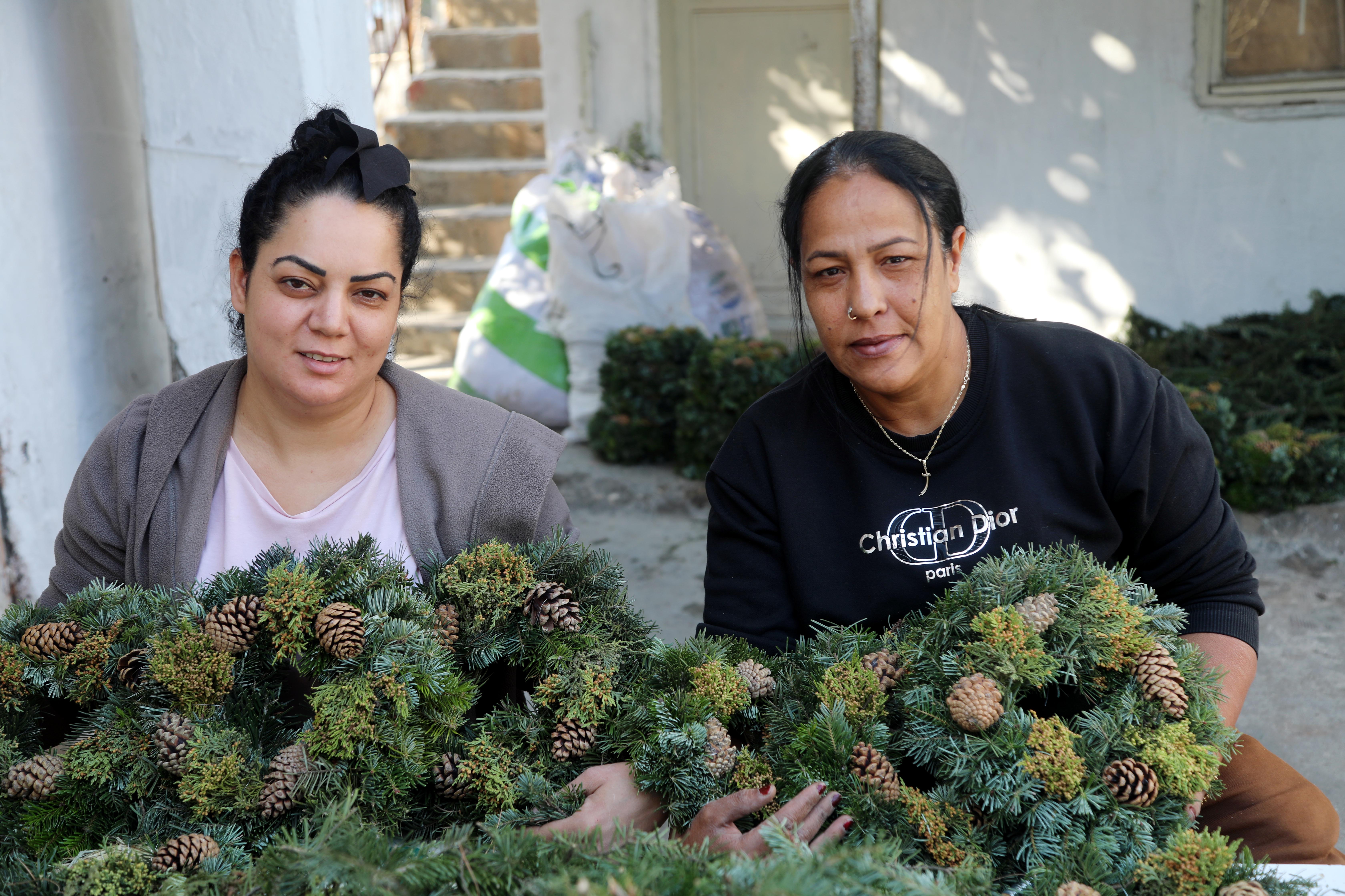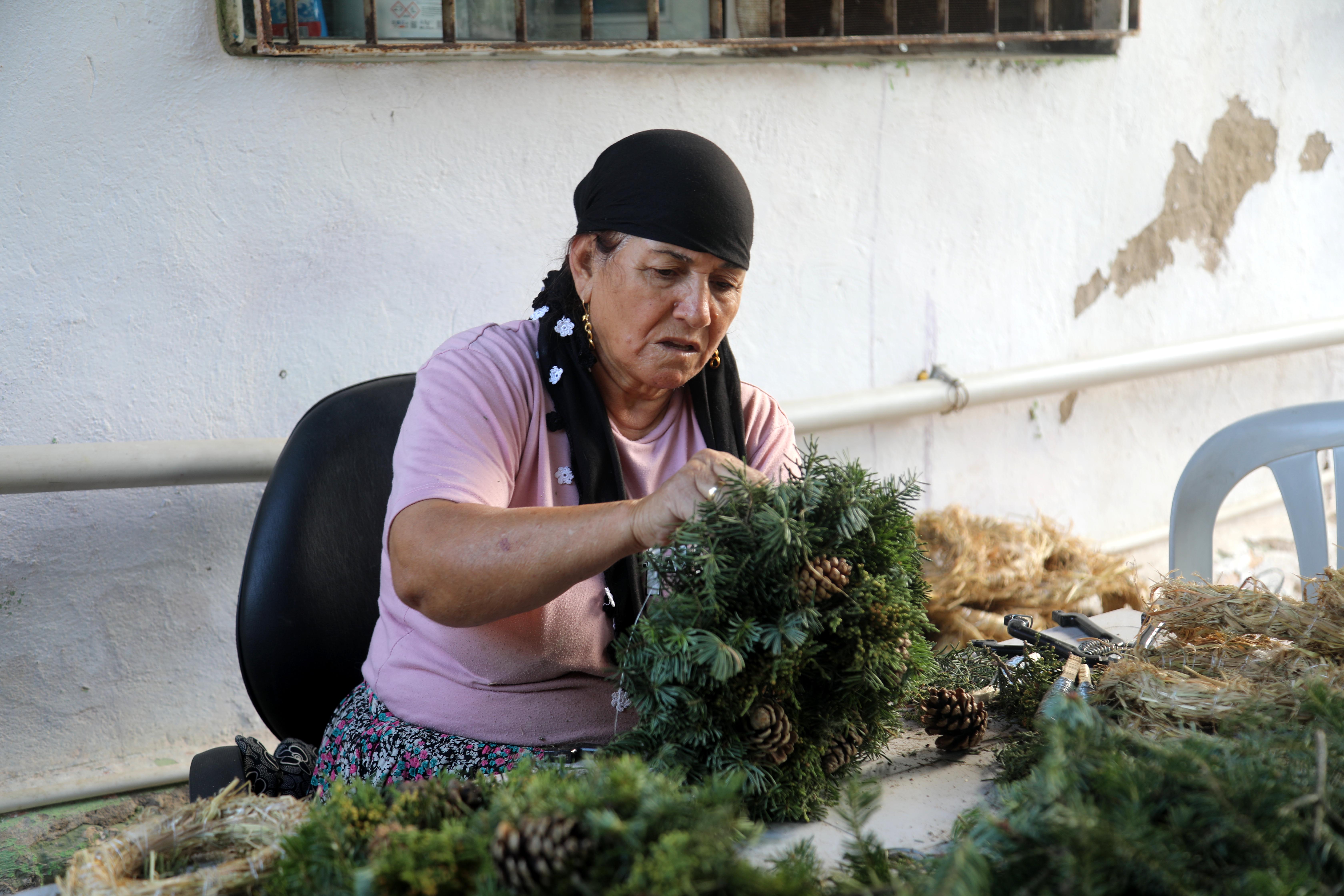 Üretici kadınlardan Canan Pehlivan (45), 10 yıldır çelenk yaptığını söyleyerek, "Önceden depolarda çalışıyorduk, sonra evlerimize verilmeye başlandı. Ailece, çocuklarımızla birlikte yapıyoruz. Çok zahmetli ama emeğimizin karşılığını alıyoruz. Günde 40-60 çelenk yapıyoruz. Erken başlarsak 60'ı buluruz" diye konuştu.