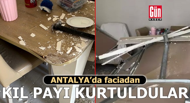 Olay, geçen hafta cuma günü Finike ilçesi İskele Mahallesi'ndeki bir apartmanın 2'nci katındaki dairede meydana geldi. Ü.B.'nin 2 çocuğuyla birlikte kiracı olarak oturduğu evin salonundaki asma tavan, henüz bilinmeyen nedenle çöktü. Birkaç dakika önce yan odaya geçen anne ve 2 çocuğu çöken tavanın altında kalmaktan son anda kurtuldu. Olay sonrası tavanda ve salondaki eşyalarda hasar oluştu.
