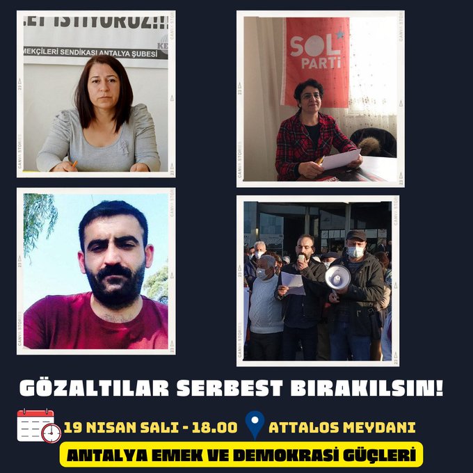 Antalya Emek ve Demokrasi Güçleri adına yapılan açıklamada ise gözaltılar nedeniyle bugün (salı) saat 18.00'de Attalos Meydanı'nda bir toplantı düzenleneceği belirtildi.