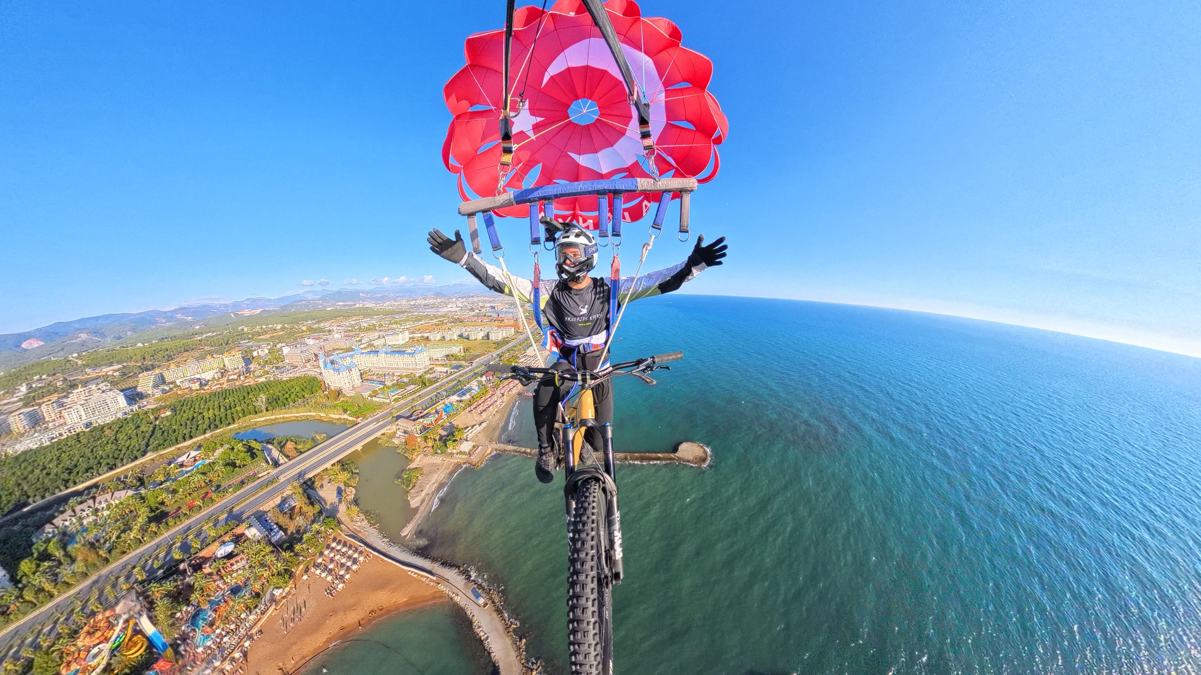 Alanya'da Türkler Mahallesi açıklarında gerçekleştirilen etkinlikte, Sky to Sea Dağ Bisikleti Yarışı'nın 'hardtail' kategorisi birincisi ve Antalya'da düzenlenen DownTown yarışlarında Türkiye birincisi olan Mevlüt Çavuşoğlu Spor Lisesi öğrencisi Yiğit Efe Al, özel olarak hazırlanan düzeneğiyle dağ bisikletini deniz paraşütü sistemine bağladı. Teknenin hızlanmasıyla metrelerce yüksekliğe ulaşan Yiğit Efe Al, Türk bayrağı desenli ve üzerinde 'Alanya' yazılı paraşütle gökyüzünde süzülmeye başladı. Bisikletiyle deniz üzerinde ilerleyen sporcu, zaman zaman iskelelere ve dalgakıranlara teker koyarak kısa inişler yaptı ve ardından yeniden yükselerek gökyüzünde pedal çevirmeye devam etti. El sallayarak kendisini izleyenleri selamlayan Al, sahildeki vatandaşlar ve turistlerden alkış aldı. Gösteri boyunca kafa kamerası ve dronla çekim yapan genç sporcu, adrenalin dolu anlarını kayıt altına aldı. Görüntülerde Al'ın bisikletiyle paraşüt altında denge kurduğu, gökyüzünde bisiklet sürüyormuş gibi süzüldüğü anlar dikkati çekti.