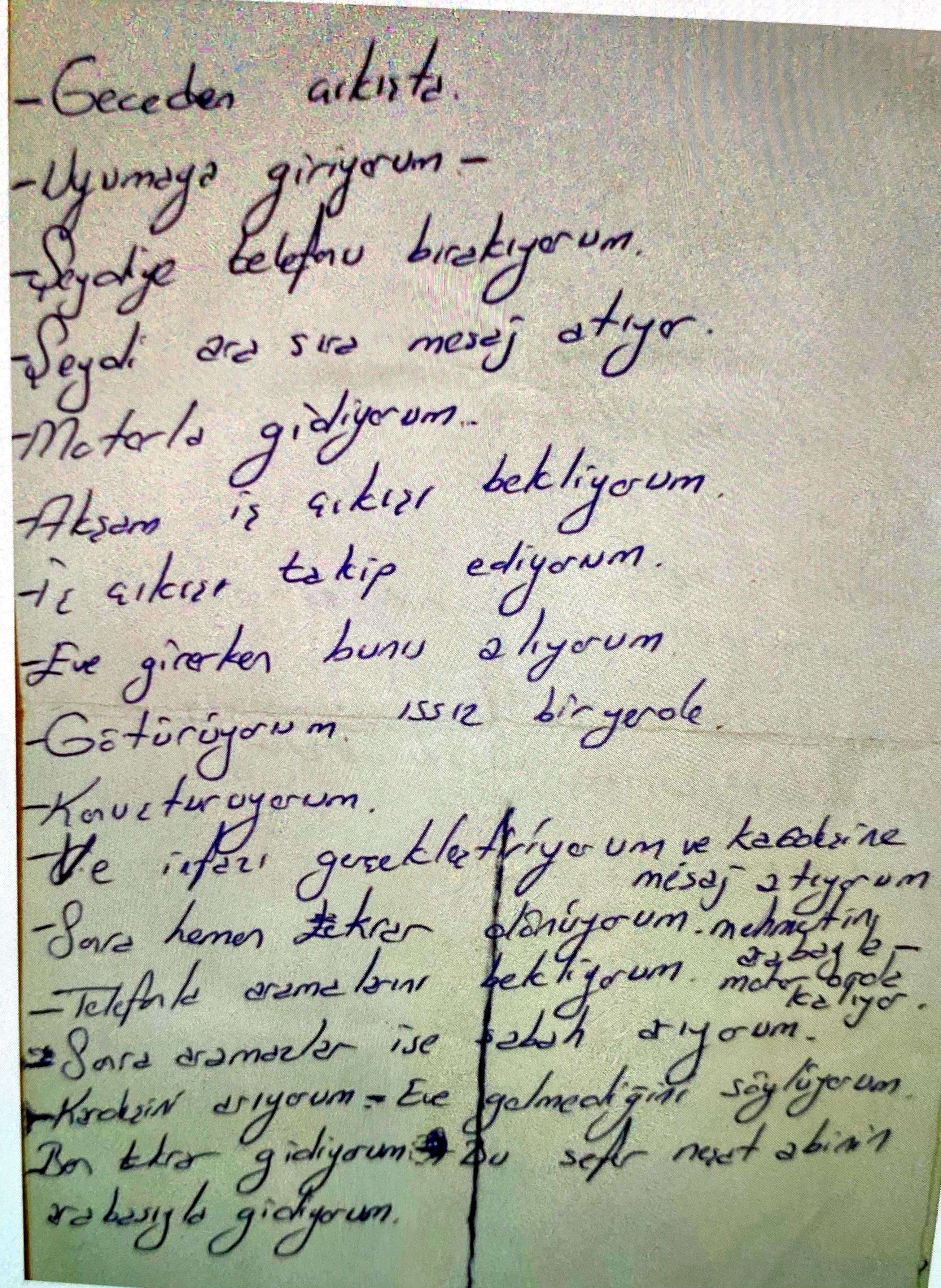 Olayın ardından müştekiler tarafından sanığın cüzdanında bulunan ve eski eşini öldüreceğini yazdığı notta, "Geceden çıkışta uyumaya gidiyorum. Seydi'ye telefonu bırakıyorum. Seydi ara sıra mesaj atıyor. Motorla gidiyorum. Akşam iş çıkışı bekliyorum. İş çıkışı takip ediyorum, eve girerken bunu alıyorum, götürüyorum, ıssız bir yerde konuşturuyorum ve infazı gerçekleştiriyorum" ifadeleri yer aldı.