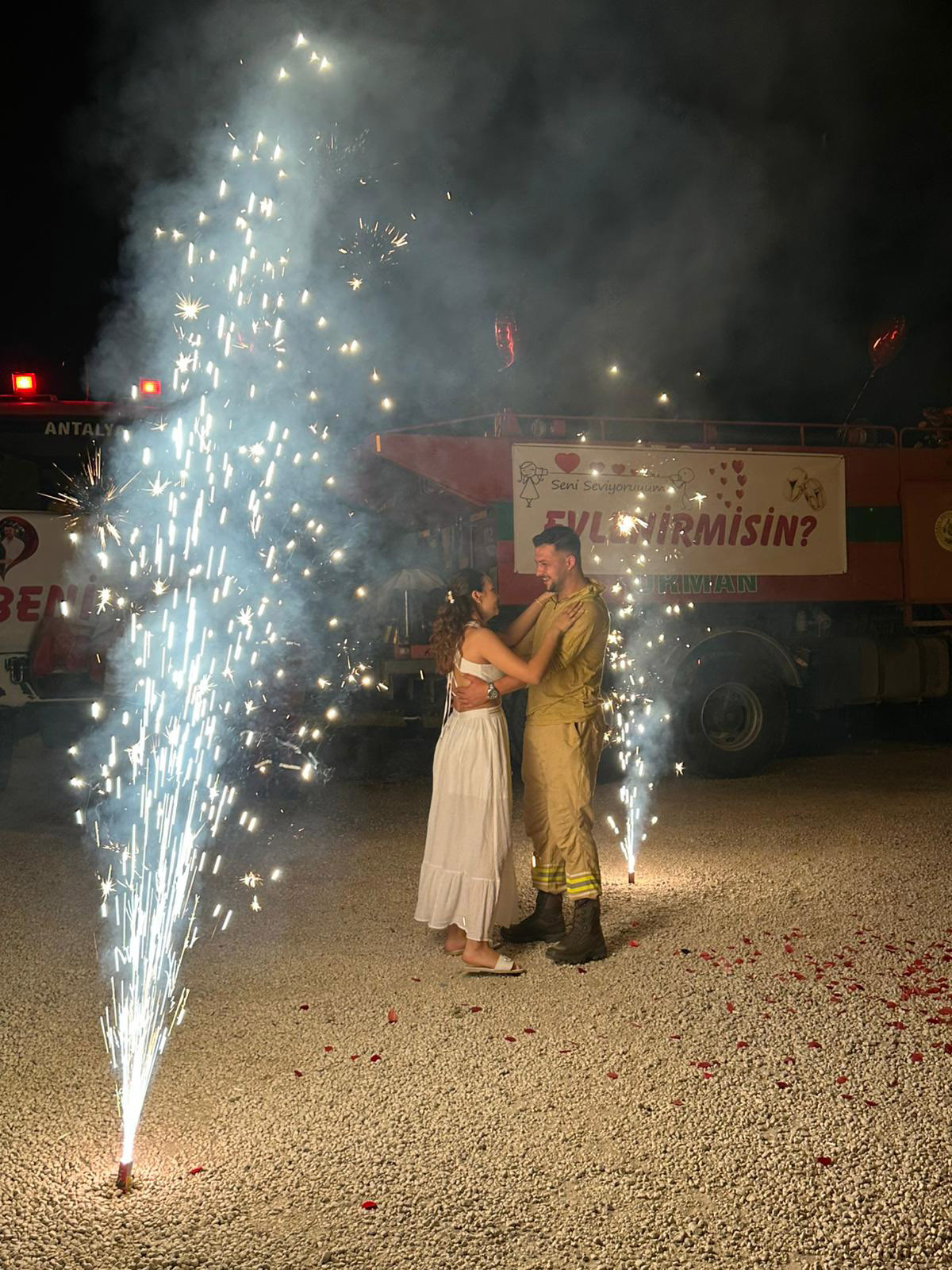 Serik Orman İşletme Müdürlüğü'ne bağlı Akbaş Orman İşletme Şefliği'nde görev yapan İsmail Deveci, kız arkadaşı Ayşe Nur Aytaç'a sürpriz evlilik teklifi için mesai arkadaşlarıyla hazırlık yaptı. Deveci, arkadaşlarının yardımıyla arazöze 'Seni seviyorum, benimle evlenir misin?' yazılı pankart astı. Ayşe Nur Aytaç, ziyaret için Orman İşletme Şefliği'ne gelince, dizlerinin üzerine çöken Deveci, yüzüğü uzatıp, "Benimle evlenir misin?" dedi. 'Evet' cevabı alan Deveci'nin çalışma arkadaşları meşale yakıp, ikilinin heyecanına tanıklık etti. Çalan müzikle dans eden çift, mutluluğunu diğer orman işçileriyle paylaştı. Deveci, "2019 yılından beri arkadaşlığımızı devam ettirdik. Bugün beni iş yerimde ziyaret eden kız arkadaşıma, arkadaşlarımın da desteğiyle, 'Memleketin bütün ateşini söndürdüm, sana olan sevda ateşimi söndüremedim' diyerek evlilik teklifinde bulundum. 6 yıldır bu anı bekliyordum. 6 Aralık'ta nişan yapacağız" diye konuştu.