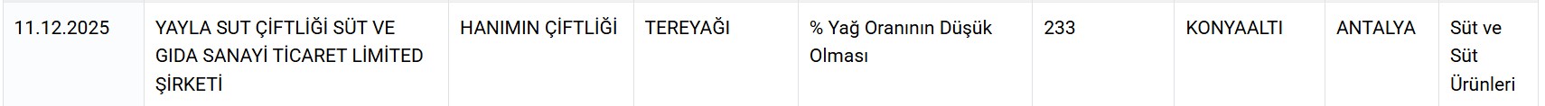 Denetimlerde bazı yoğurt ürünlerinde nişasta kullanıldığı, tereyağında süt harici yağ bulunduğu, manda kaymağında ise inek sütü tespit edildi. Bu ürünler, taklit veya tağşiş yapıldığı belirlenen gıdalar arasında yer aldı.