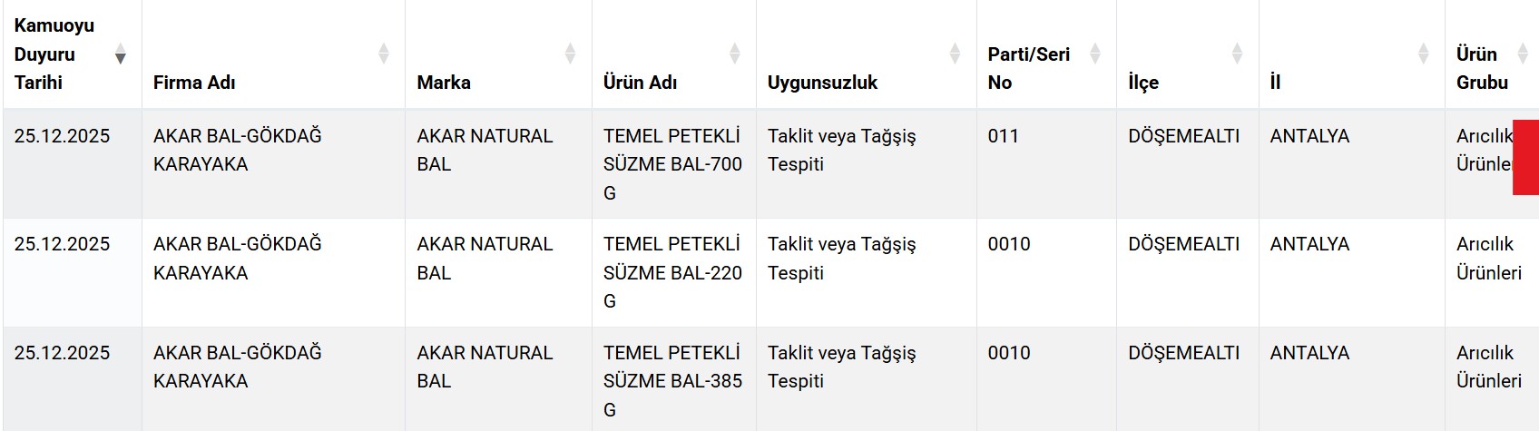 Listede yer alan 15 süzme ve petekli bal ürününde taklit ve tağşiş bulgularına rastlandı. Bakanlık, bal ürünlerinde mevzuata aykırı uygulamaların tespit edildiğini duyurdu.