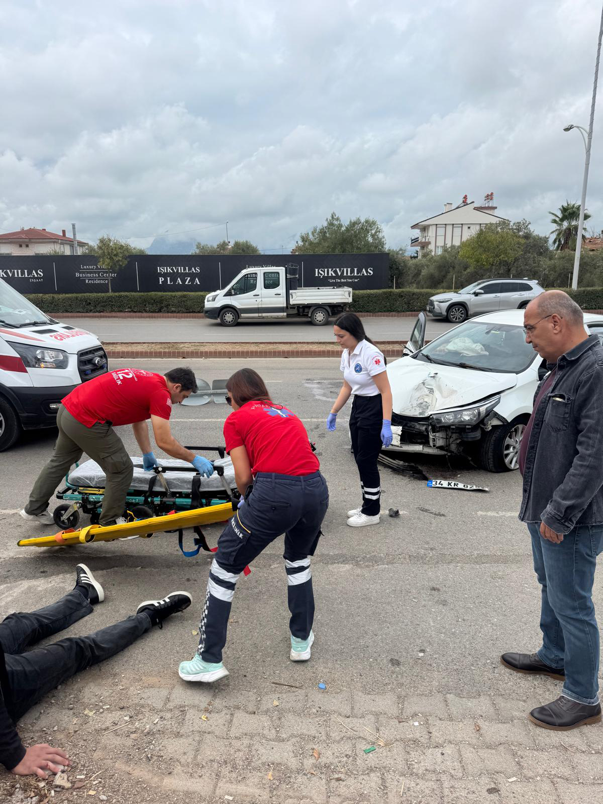 Kaza, saat 10.00 sıralarında ilçeye bağlı Yeşilbayır Mahallesi Atatürk Caddesi üzerinde meydana geldi. İlçe merkezinden Antalya istikametine seyir halindeki Ömer Faruk E.'nin kullandığı 34 KR 8252 plakalı otomobil cadde üzerinde bulunan kontrolsüz kavşağa yaklaşırken dönüş yapmaya hazırlanan Burhan Y.'nin kullandığı 07 ASA 549 plakalı otomobille çarpıştı. Refüje savrularak yön levhası ve Kent Güvenliği Sistemi kamerası direğine çarparak durabilen otomobilin sürücüsü Ömer Faruk E. ve beraberindeki Serap Ç. yaralandı. Kazayı görenlerin ihbarı üzerine olay yerine gelen sağlık ekiplerinin yaptıkları ilk müdahalenin ardından yaralılar ambulanslarla Antalya Şehir Hastanesi'ne götürüldü.