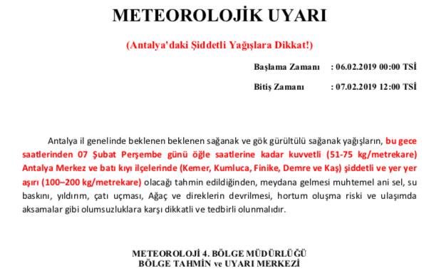 Antalya Valiliği’nden konuyla ilgili yapılan açıklamada, "Meteoroloji 4. Bölge Müdürlüğümüzün uyarısı gereği; 5 ilçemizde (Kemer, Kumluca, Finike, Demre ve Kaş) fırtınanın hızının 100 km/sa geçeceği ve hortum riski oluşturacağı değerlendirildiğinden Valiliğimizce 06.02.1019 Çarşamba günü tüm resmi ve özel kreş, anaokulu, ilkokul, ortaokul ve liselerde eğitime bir gün ara verilmiştir" denildi.