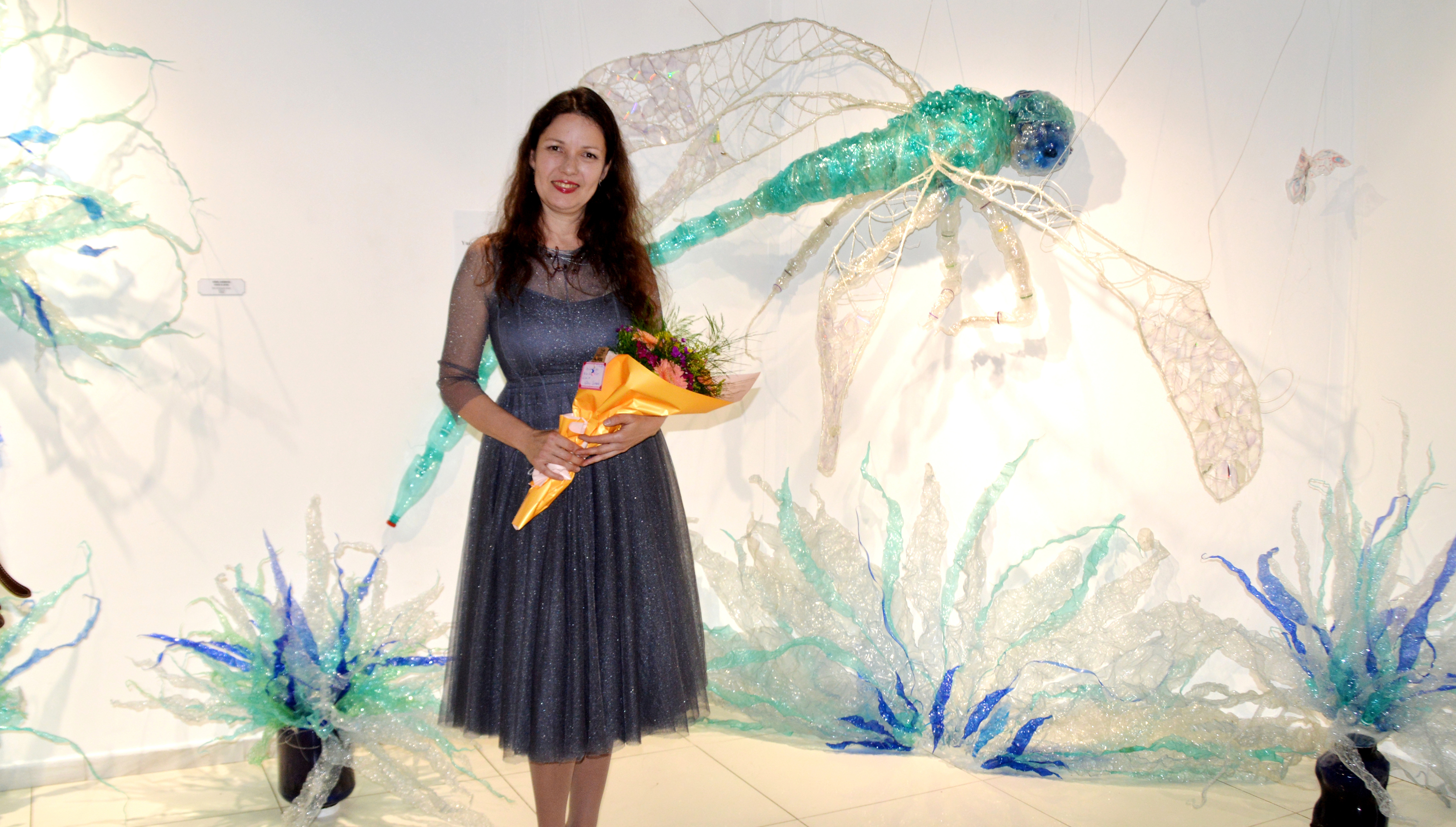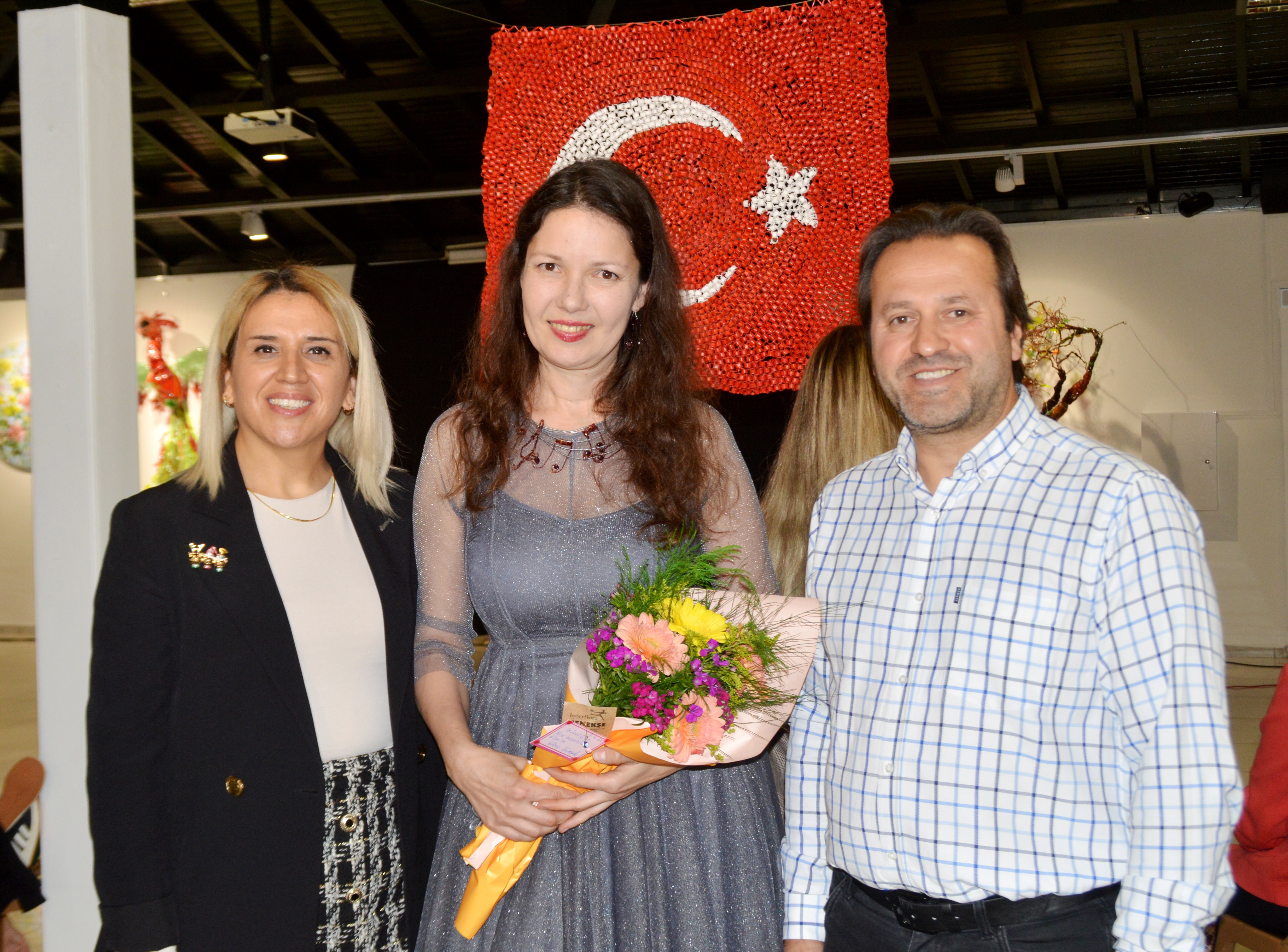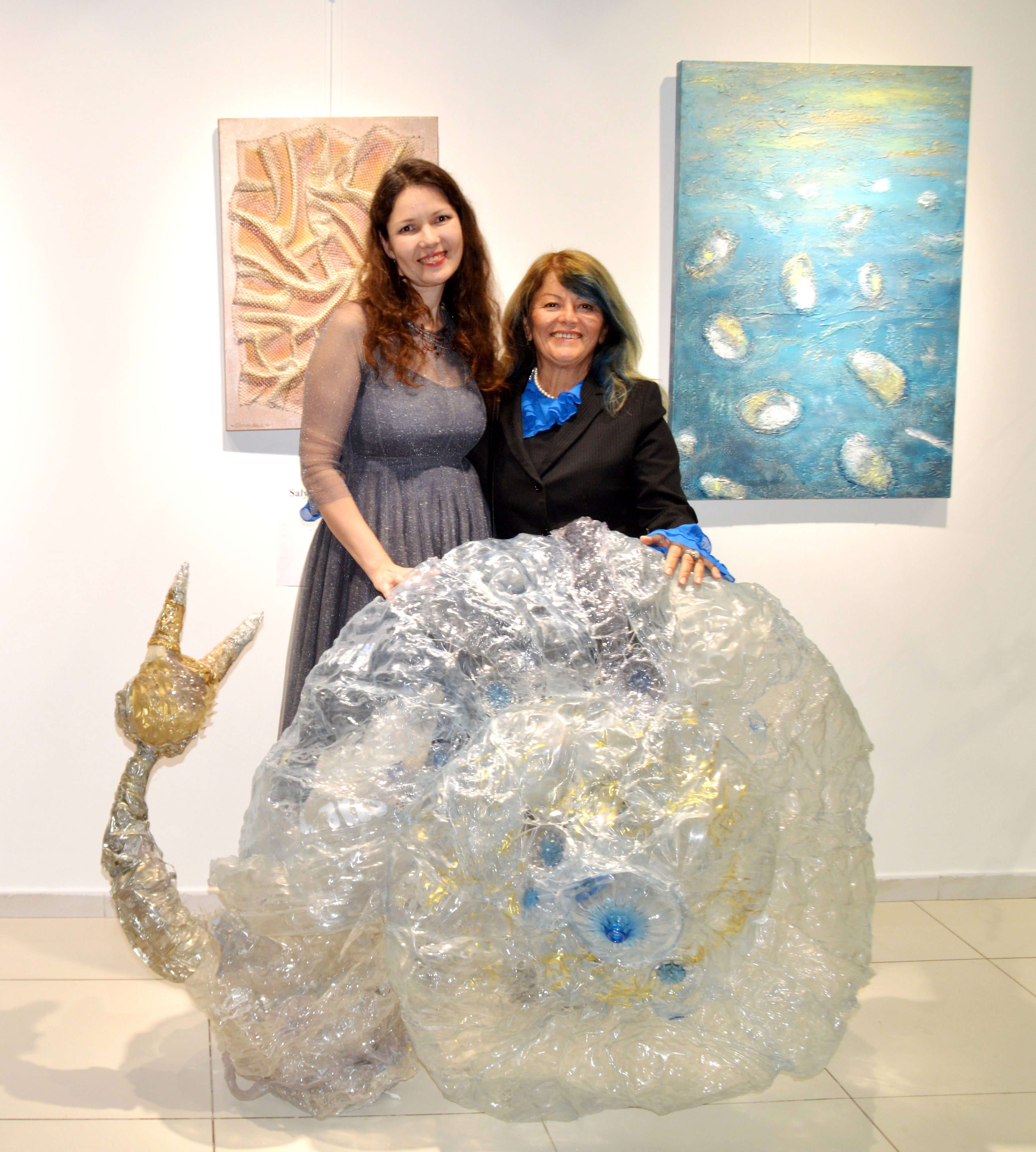 Atık plastiklerin sanatla buluşturulduğu çevre dostu sergiye; Güzel Amirova'nın atık kumaş, karton kutuları kullanarak üzerlerinde desen çalışıp duvar panosu üreten, çiçek türlerini fırçasıyla tuvale yansıtan sanatçı arkadaşları Oksana Novik Irınir ile Olga Beketova da eserleriyle destek verdi.