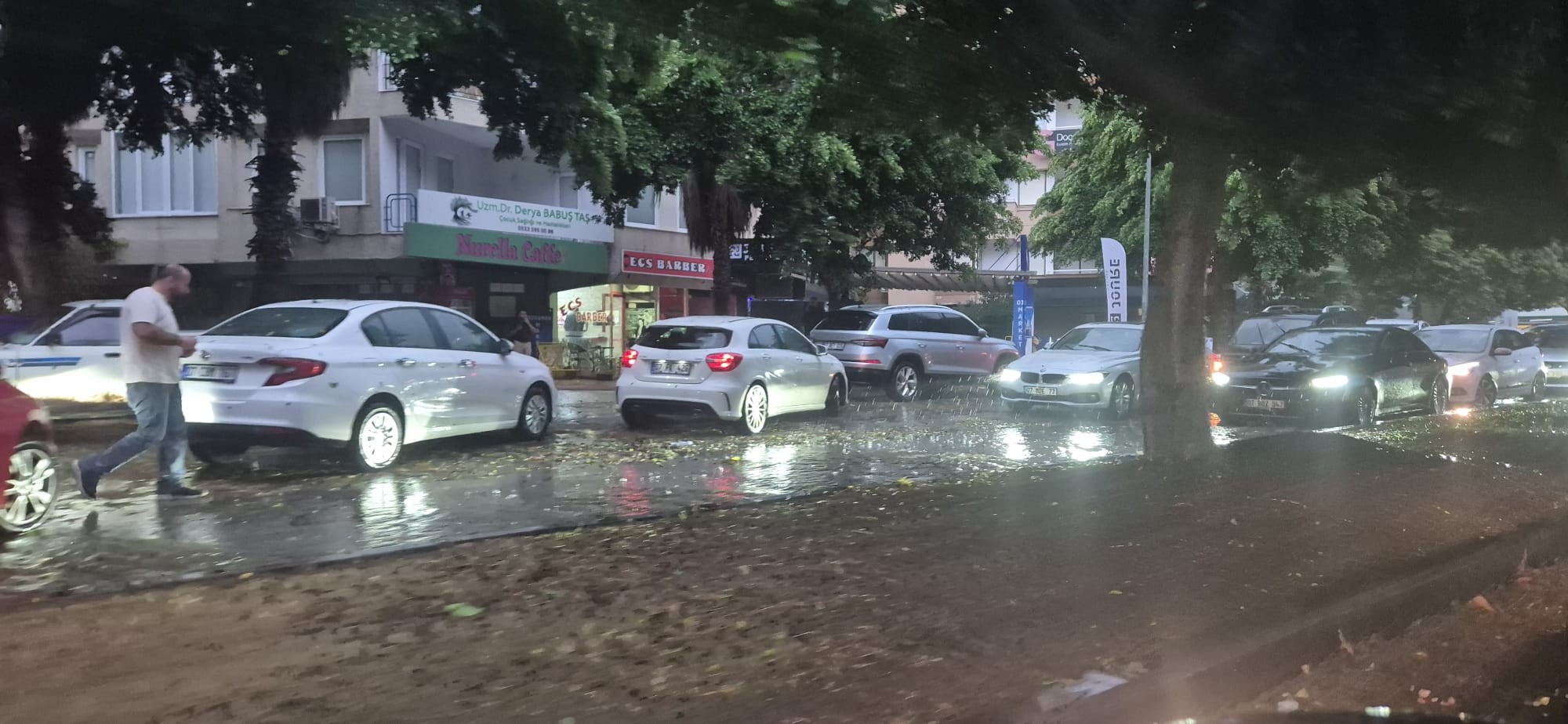 Yağışla birlikte sokak ve caddelerde su birikintileri oluştu, yol kenarlarındaki levhalar sürüklendi.