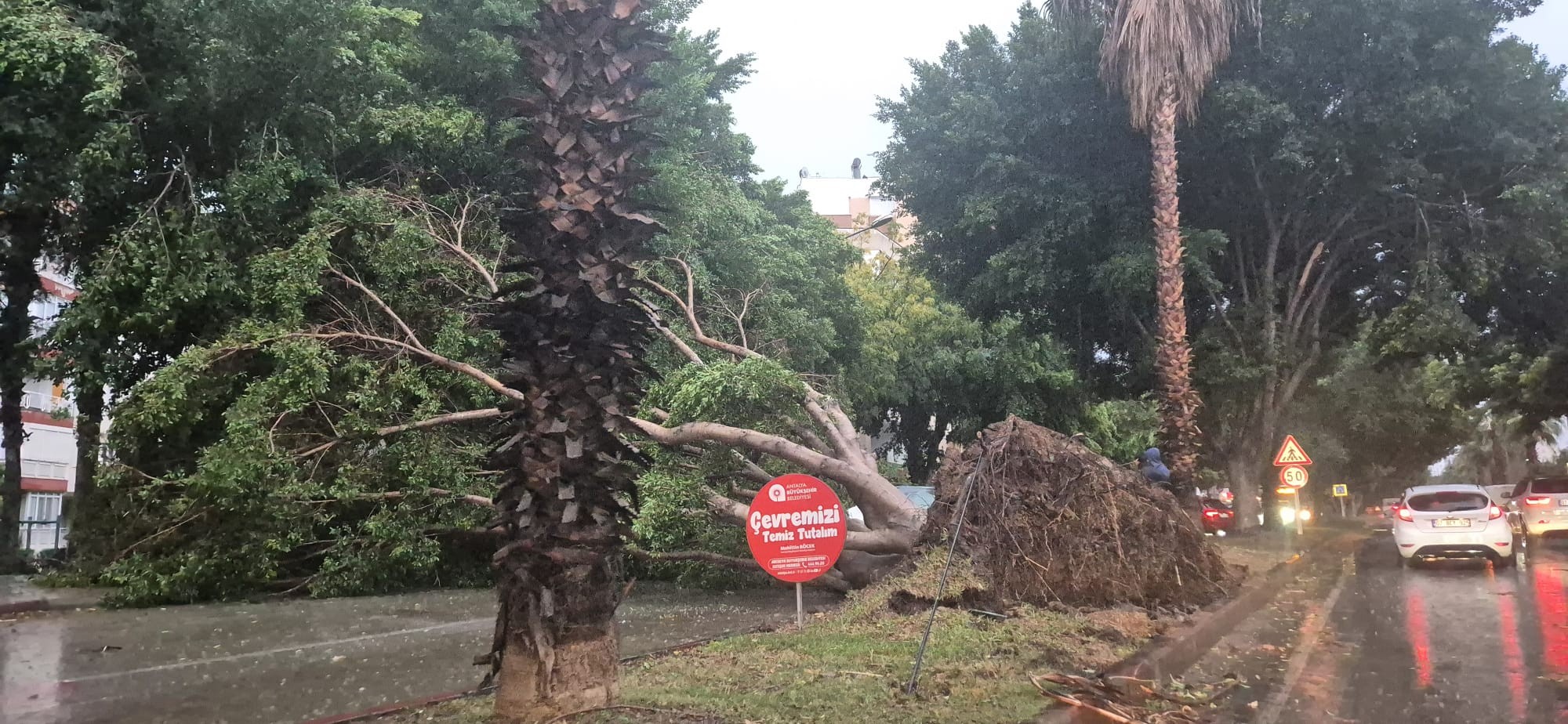 Kuvvetli rüzgarla birlikte bazı ağaçlar ile işletmelerin tenteleri devrildi, masa ve sandalyeler savruldu.