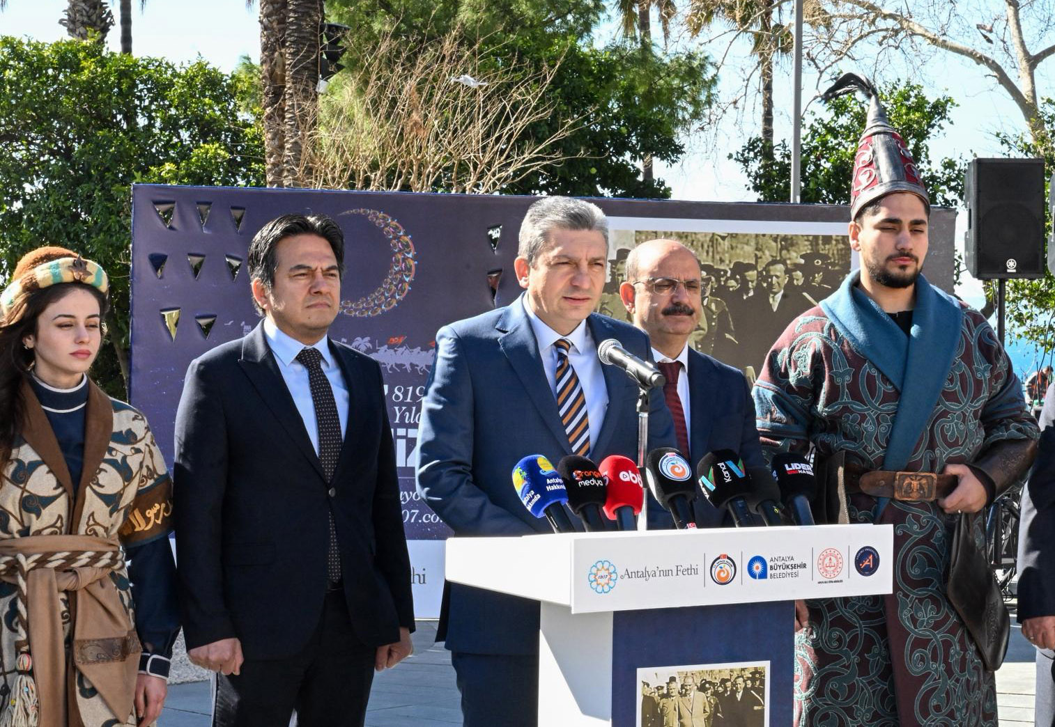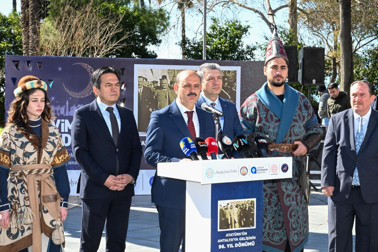 Antalya'nın fethinin 819. yıl dönümü ve Gazi Mustafa Kemal Atatürk'ün Antalya'ya gelişinin 96. yıl dönümü dolayısıyla Antalya Valisi Hulusi Şahin başkanlığında basın toplantısı düzenlendi. Yavuz Özcan Parkı 1. Gıyaseddin Keyhüsrev heykeli önünde düzenlenen toplantıya Vali Hulusi Şahin, Antalya Büyükşehir Belediyesi Genel Sekreter Yardımcısı Cemil Böcek, Muratpaşa Kaymakamı İhsan Kara, Akdeniz Üniversitesi Rektör Yardımcısı Şükrü Özen, ilgili kurum müdürleri ve basın mensupları katıldı.