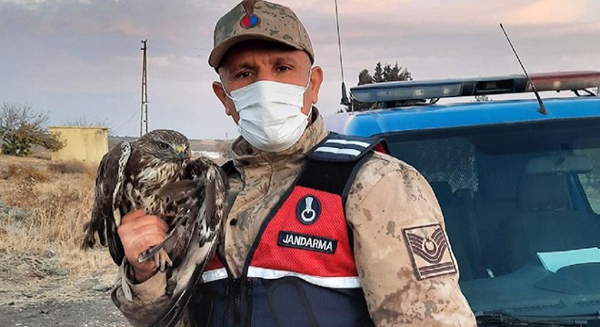 KİLİS'te, vatandaşlar tarafından bulunan yaralı şahin, jandarmaya teslim edildi.