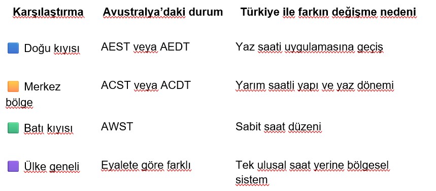 Avustralya, doğudan batıya büyük bir kara parçasına yayıldığı için üç ana saat dilimi kullanır. Bunlar AEST, ACST ve AWST olarak bilinir. Yılın belli dönemlerinde bazı eyaletlerde yaz saati uygulamasına geçilir ve bu durumda AEST, AEDT’ye, ACST ise ACDT’ye dönüşür. Türkiye ile saat farkı da bu değişimlere göre yıl içinde değişebilir. Bu yüzden iki ülke arasında görüşme planlarken dönem farkını dikkate almak gerekir.