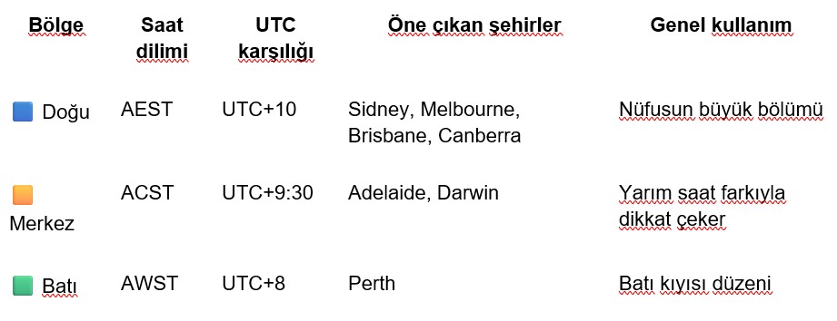 Türkiye’de yaşayan biri için en pratik yöntem, Avustralya’yı tek parça düşünmemektir. Önce şehrin hangi bölgede yer aldığına bakmak gerekir. Ardından o bölgenin yaz saati uygulamasında olup olmadığı kontrol edilmelidir.
