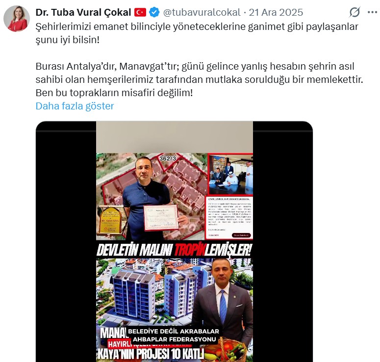 “Manavgat’ımızın tarihi silüeti maalesef menfaat uğruna bozularak, imar planları belli şahıslara göre şekillendiriliyorsa bu belediyecilik değildir. Şehir şahıslara göre şekillendirilemez! Demek ki mesele Manavgat değil, kuralların kime uygulanıp uygulanmadığı meselesidir.”