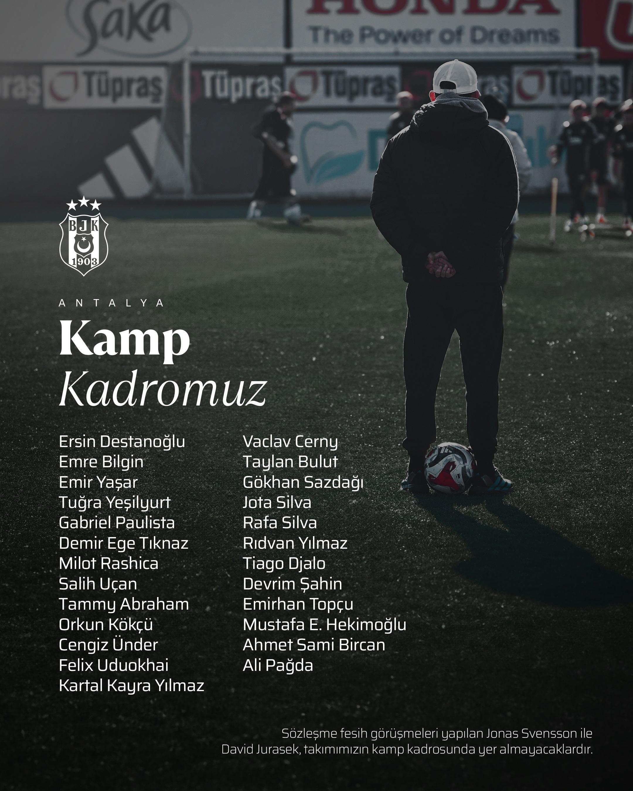 Antalya’da devre arası çalışmalarını sürdürecek siyah-beyazlılarda, sözleşme fesih görüşmeleri yapılan David Jurasek ve Jonas Svensson ile geçtiğimiz hafta futbol planlamasında yer almayacağı açıklanan Necip Uysal kamp kadrosuna dahil edilmedi.
