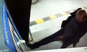 Otopark ödeme cihazını hem tekmeledi hem yumrukladı
