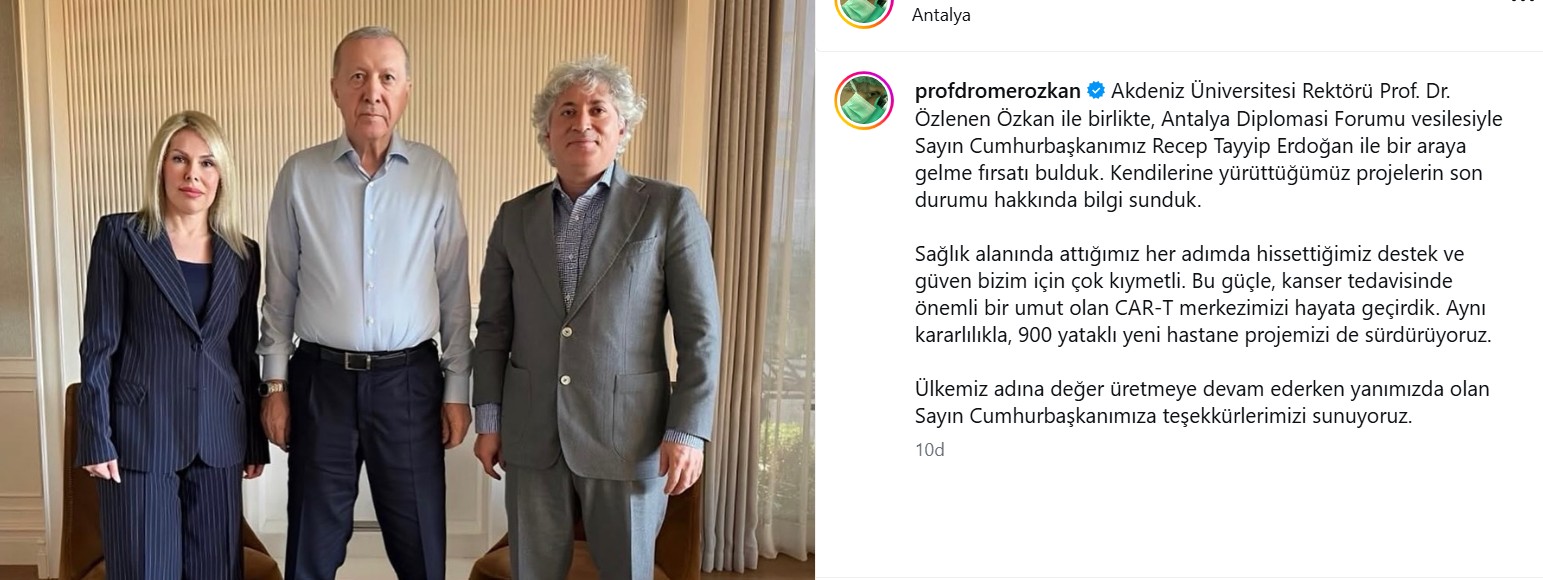 “Akdeniz Üniversitesi Rektörü Prof. Dr. Özlenen Özkan ile birlikte, Antalya Diplomasi Forumu vesilesiyle Sayın Cumhurbaşkanımız Recep Tayyip Erdoğan ile bir araya gelme fırsatı bulduk. Kendilerine yürüttüğümüz projelerin son durumu hakkında bilgi sunduk.