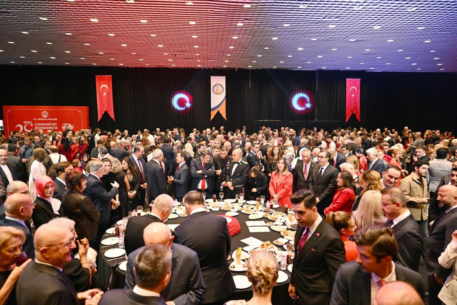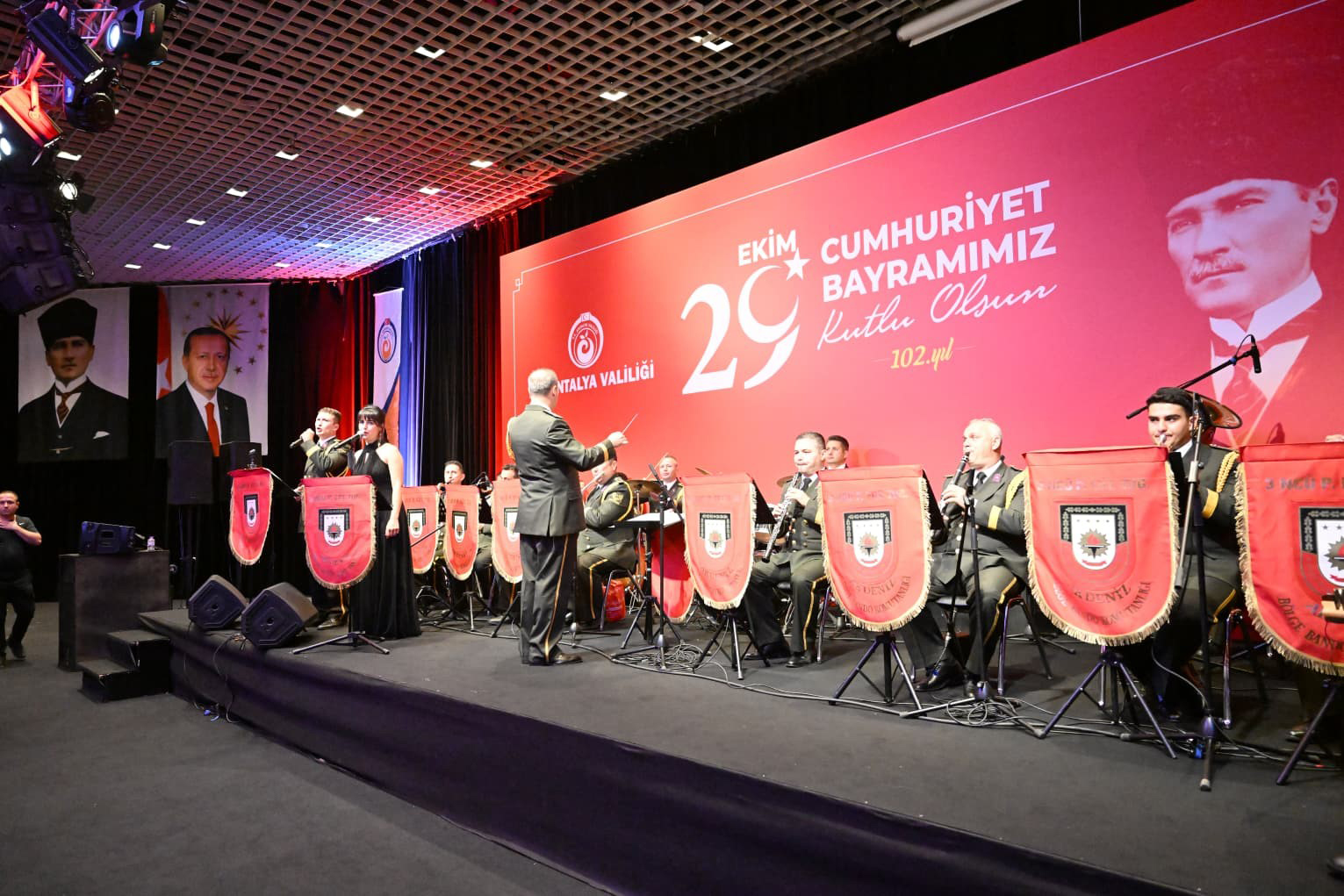 Cumhuriyetin 102'nci yılı, Antalya'da düzenlenen resepsiyonla kutlandı. Vali Hulusi Şahin ve eşi Ebru Şahin'in ev sahipliğinde gerçekleşen resepsiyona, il protokolü, kamu kurum müdürleri, sivil toplum kuruluşu temsilcileri, oda başkanları, şehit aileleri, gaziler ve milli sporcular katıldı. Vali Hulusi Şahin ve eşi Ebru Şahin, konukları kapıda karşılayarak Cumhuriyetin 102'nci yılını kutladı. Antalya 3'üncü Piyade Eğitim Tugayı Bölge Bando Takımı'nın müzik dinletisi eşliğinde gerçekleşen resepsiyonda, Antalya Devlet Konservatuvarı'ndan Doç. Dr. Sevilay Gök solist olarak sahne aldı.