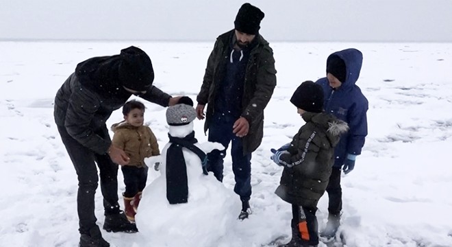 ISPARTA'da Eğirdir Gölü'nün donan kısmında yürüyüş yapanlar kar topu oynayıp, hazırladıkları kardan adamla fotoğraf çektirdi.