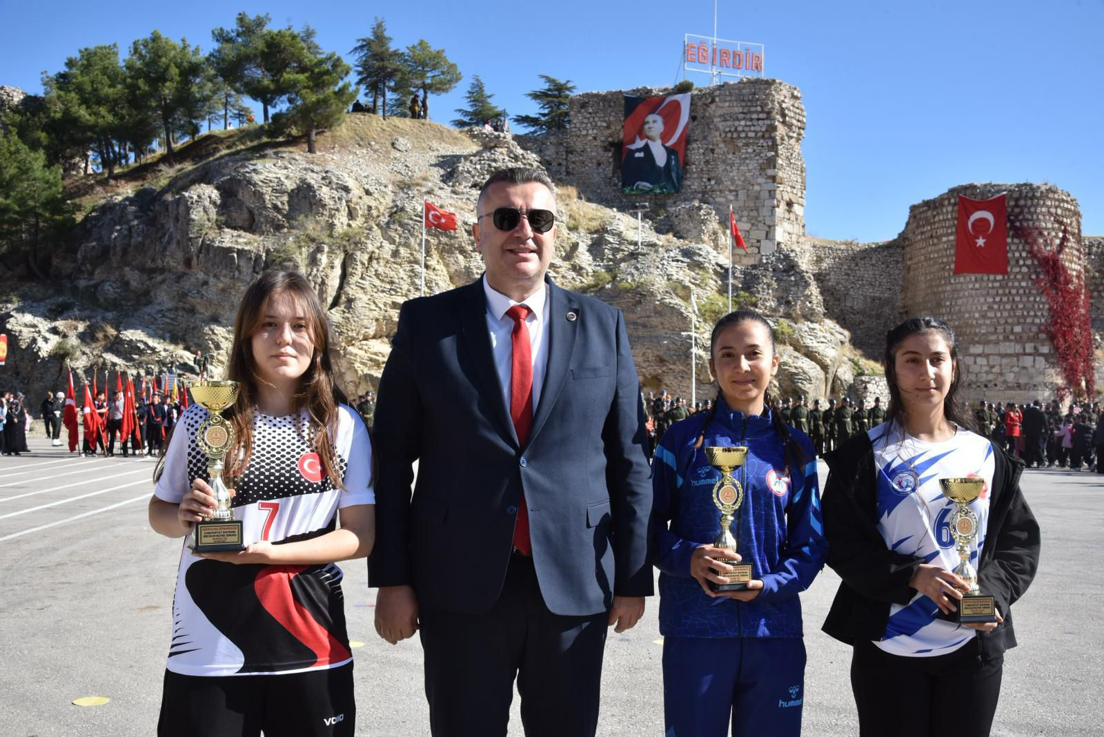 Kale Meydanı'ndaki programa Eğirdir Kaymakamı Ömer Çimşit, Eğirdir Dağ Komando Okulu Komutanı Tuğgeneral Ahmet Aşık, Eğirdir Belediye Başkanı Mustafa Özer, Cumhuriyet Savcısı Serdar Süreyya Karain, Gaziler Derneği Başkanı Hüseyin Koçaslan, kurum amirleri, protokol üyeleri, öğrenciler ve çok sayıda vatandaş katıldı. Kaymakam Çimşit'in günün anlam ve önemini belirten konuşması sonrası öğrenciler şiir okudu. Törene katılanlar, ellerindeki Türk bayraklarıyla Cumhuriyet Bayramı'nı coşkuyla kutladı.