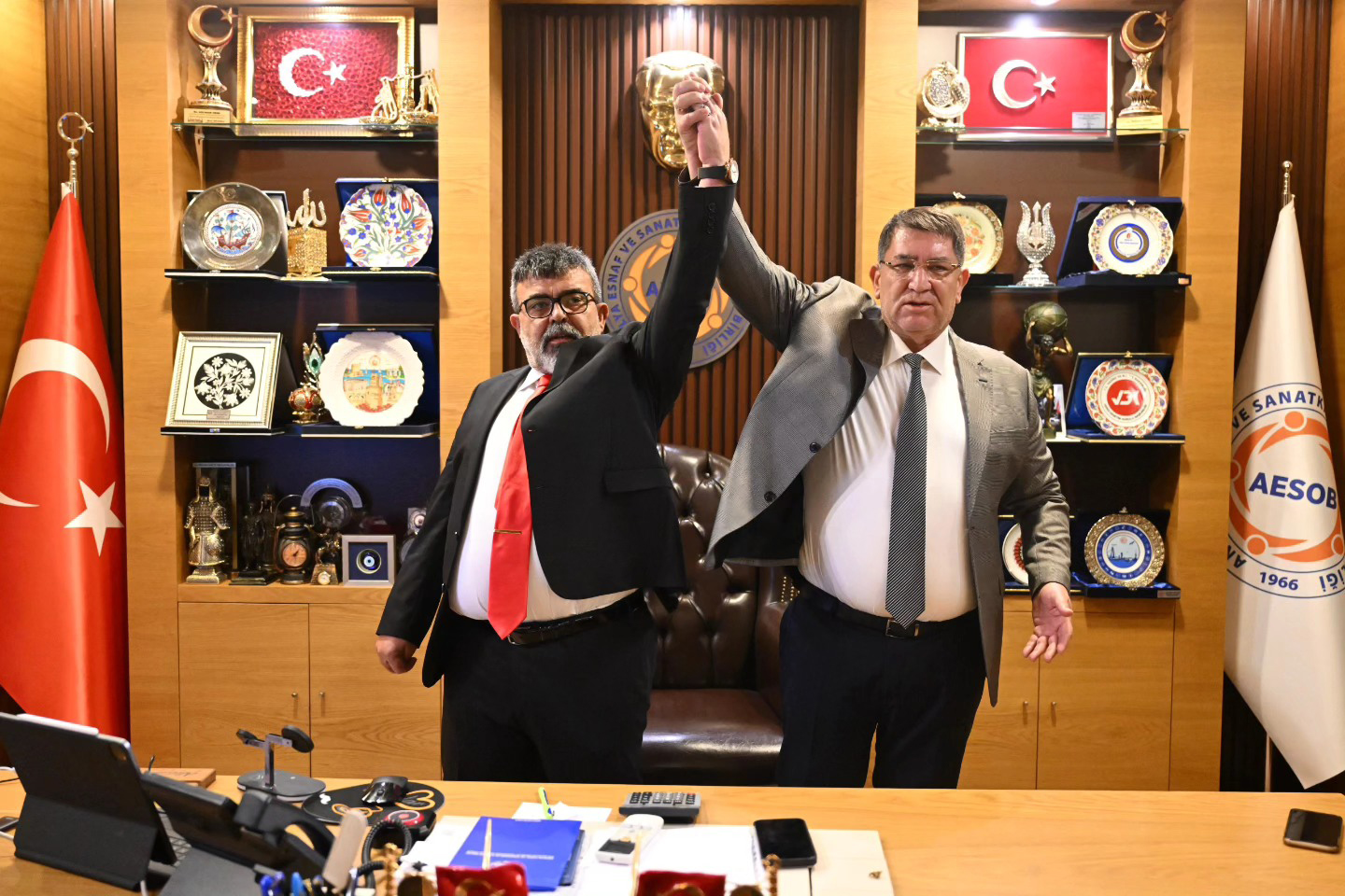 AESOB Başkanı Adlıhan Dere, divan başkanlığını yaptığı Kasaplar Odası ve Lastikçiler Odası seçimleri sonrasında Osman Yardımcı ve Bayram Dal ile el ele zafer görüntüsü verdi. Dere, kayıtsız şartsız Birlik seçimlerinden Yardımcı ve Dal'ın kendisini desteklediğini belirten bir açıklama ile iki başkanı kutladı.