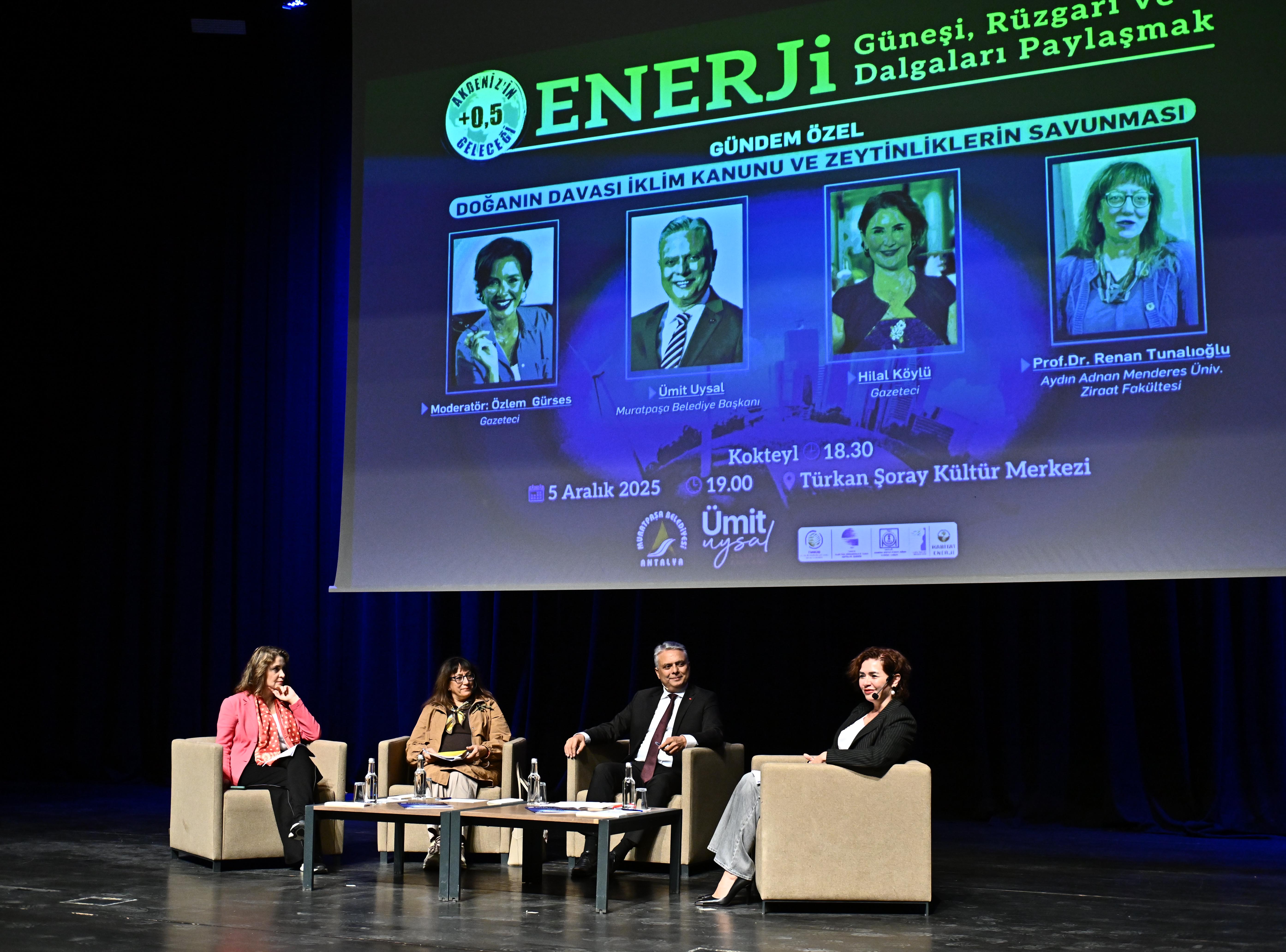Antalya Muratpaşa Belediyesi’nin “Enerji: Güneşi, Rüzgârı ve Dalgaları Paylaşmak” temasıyla bu yıl 5’incisini düzenlediği +0.5 Akdeniz’in Geleceği Çalıştayı kapsamında Türkan Şoray Kültür Merkezi’nde gazeteci Özlem Gürses moderatörlüğünde “Doğanın Davası: İklim Kanunu ve Zeytinliklerin Savunması” başlıklı Gündem Özel oturumu gerçekleştirildi.