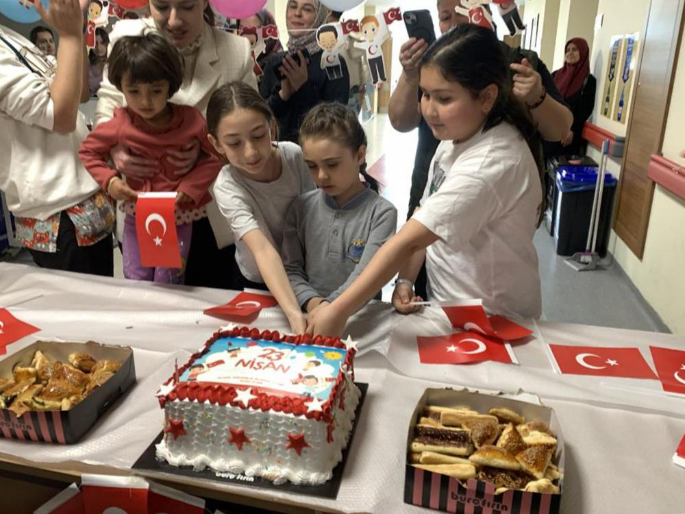 23 Nisan Ulusal Egemenlik ve Çocuk Bayramı kapsamında, bayram coşkusuna katılamayan ve tedavileri Burdur Devlet Hastanesi'nde devam eden çocukları için özel etkinlik düzenlendi. Bayraklar ve balonlarla süslenen servis alanında gerçekleştirilen programda, tedavi gören çocuklar 23 Nisan temalı pasta keserek müzik eşliğinde keyifli anlar yaşadı. Yapılan ikramlarla bayramın tadını çıkaran çocuklar, günün anısına hatıra fotoğrafları çektirdi.