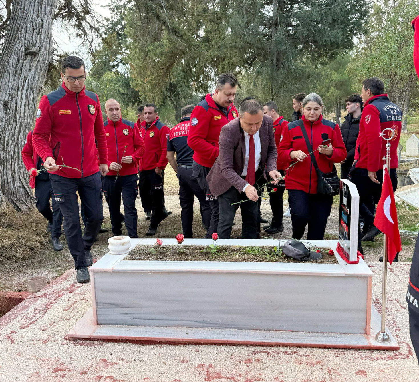 BURDUR Belediyesi itfaiye personeli 2 yıl önce mesaiye gelirken trafik kazasında ölen iş arkadaşları Muharrem Çelen'i mezarı başında andı.