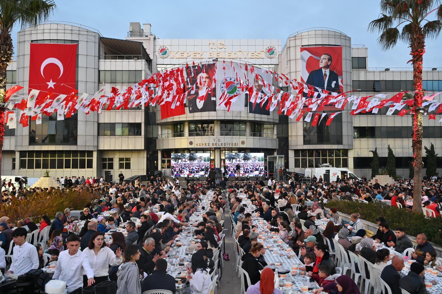 Kepez Belediyesi, Ramazan ayında Kadir Gecesi’nin huzur ve bereketini büyük bir iftar programıyla taçlandırdı. Belediye hizmet binası önünde düzenlenen 5 bin kişilik iftar programı; siyasetçilerden yerel yöneticilere, geçmiş dönem belediye başkanlarından meclis üyelerine kadar geniş bir katılımla birlik ve beraberliğe ev sahipliği yaptı. İftar programına CHP Genel Başkan Yardımcısı Gökan Zeybek, Cumhuriyet Halk Partisi PM Üyesi Önder Kurnaz, PM Üyesi ve Antalya Milletvekili Cavit Arı, YDK Üyesi ve Antalya Milletvekili Aliye Coşar, Antalya Milletvekili Aykut Kaya, CHP İl Başkanı Nail Kamacı, İlçe Başkanı Gökhan Ölmez, il, ilçe kadın ve gençlik kolları başkanı, önceki dönem Kepez Belediye Başkanı İsa Akdemir ve Mehmet Atay, siyasi partilerin ilçe başkanları, önceki dönem ve yeni dönem meclis üyeleri, muhtarlar, belediye çalışanları ve aileleri katıldı.