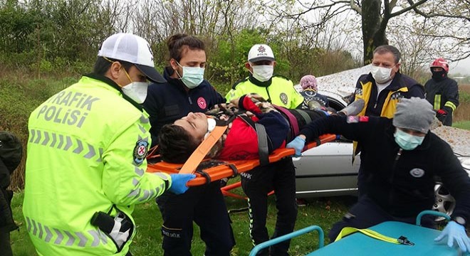 İZMİT'te yağmur nedeniyle kayganlaşan yolda kontrolden çıkan otomobilin ...