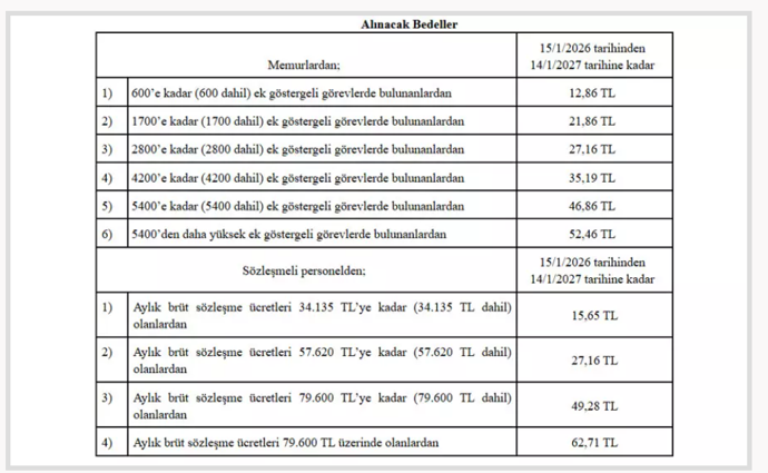 15 Ocak 2026'dan 14 Ocak 2027'ye kadar öğle yemeği servisinden faydalanacak memurlardan günlük 12,86 lira ile 52,46 lira arasında bedel tahsil edilecek. Sözleşmeli personel de aldıkları ücrete göre günlük 15,65 lira ile 62,71 lira arasında öğle yemeği bedeli ödeyecek.