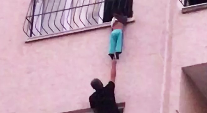 ADANA'da, 4'üncü kattaki evlerinin salonundaki pencerenin oturmak istediği pervazından kayan 2,5 yaşındaki Cihan Can, başı korkuluk demirine sıkışınca asılı kaldı. 10 yaşındaki ağabeyi Özgür Can'ın kıyafetlerinden yakalayıp, düşmesini engellediği Cihan, seferber olan mahalleli tarafından kurtarıldı.