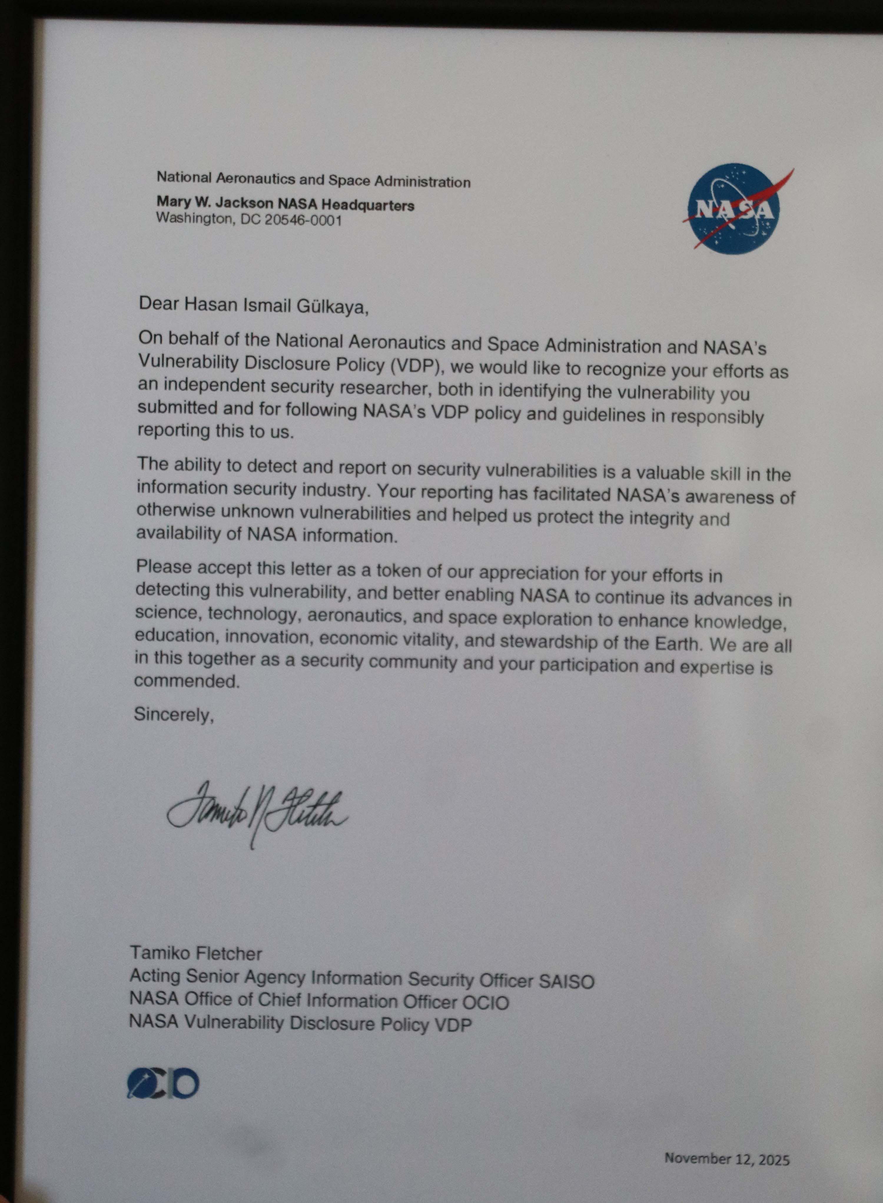Ulusal Havacılık ve Uzay Dairesi Mary W. Jackson NASA Merkezleri Kıdemli Ajans Bilgi Güvenliği Sorumlusu Tamiko Fletcher imzalı mektupta, şu ifadeler yer aldı: "Ulusal Havacılık ve Uzay Dairesi (NASA) ve NASA’nın Zafiyet Açıklama Politikası (VDP) adına, bağımsız bir güvenlik araştırmacısı olarak gösterdiğiniz çabaları takdir etmek isteriz. Bildirdiğiniz güvenlik açığını tespit etmeniz ve NASA'nın VDP politika ve yönergelerini izleyerek bu durumu sorumlu bir şekilde bize bildirmeniz nedeniyle teşekkür ederiz. Güvenlik açıklarını tespit etme ve raporlama yeteneği, bilgi güvenliği sektöründe değerli bir beceridir. Yaptığınız bildirim, NASA’nın aksi takdirde bilinmeyebilecek güvenlik açıklarının farkına varmasını sağlamış ve NASA bilgilerinin bütünlüğünü ve erişilebilirliğini korumamıza yardımcı olmuştur. Lütfen bu mektubu, bu güvenlik açığını tespit etme konusundaki çabalarınız ve NASA’nın bilimi, teknolojiyi, havacılığı ve uzay araştırmalarını ilerletme misyonunda güvenliğini artırmaya katkınız için bir teşekkür ifadesi olarak kabul ediniz. Bilginin geliştirilmesi, eğitim, inovasyon, ekonomik canlılık ve dünyanın sorumlu yönetimi için birlikte çalışıyoruz. Bir güvenlik topluluğu olarak hepimiz bu işin içindeyiz ve katılımınız ile uzmanlığınız takdire değerdir."