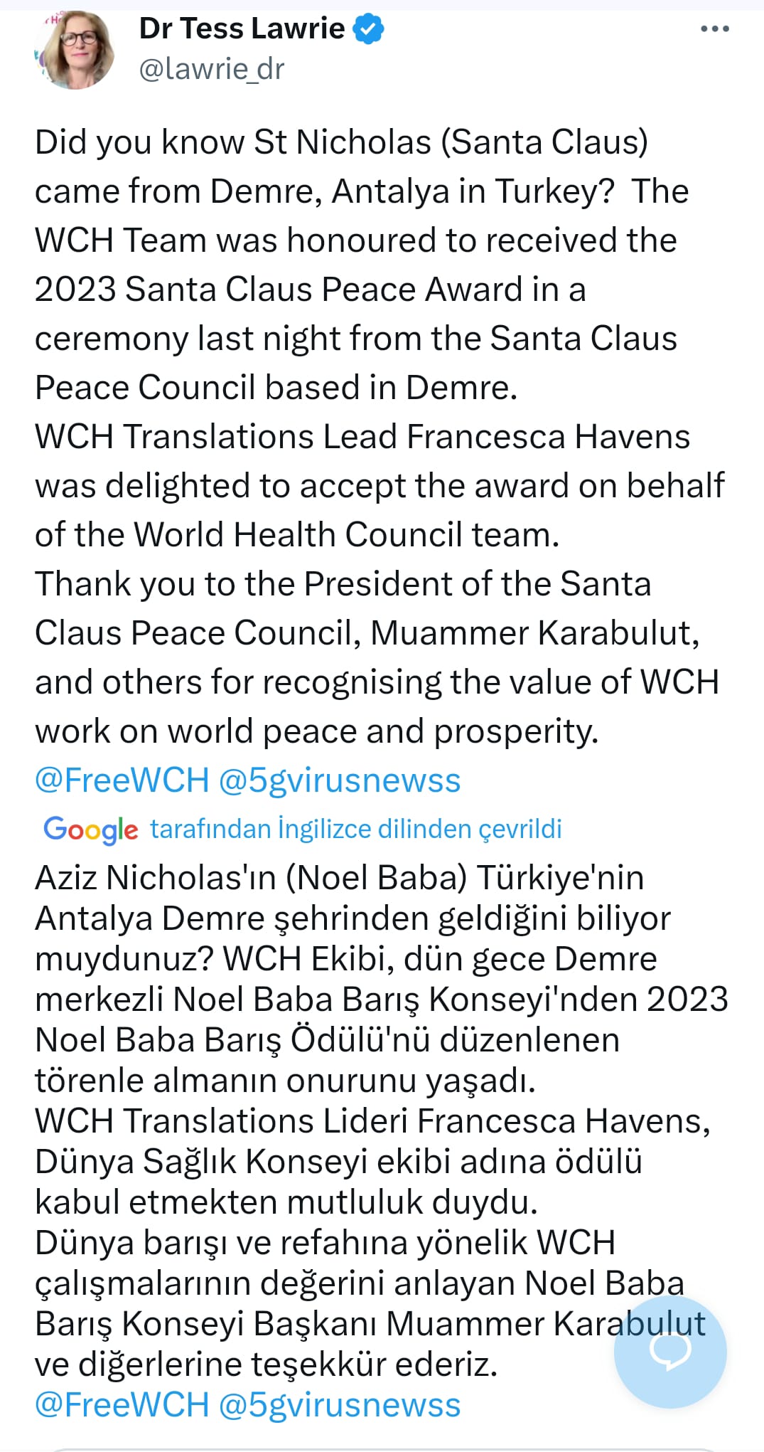 Bu arada Dünya Sağlık Konseyi yöneticisi lideri Dr. Tess Lawrie, Noel Baba Barış Ödülü almalarından dolayı paylaşımda bulundu.