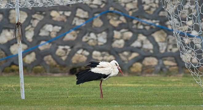 Göç yolundaki leylek, dinlenmek için stadyuma indi