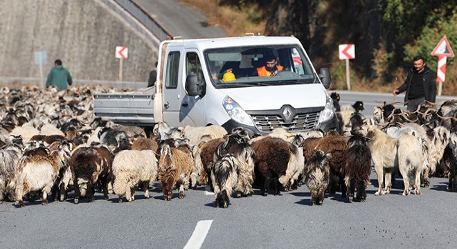 Koyun sürüsü ile karayoluna çıktı, trafik kilitlendi